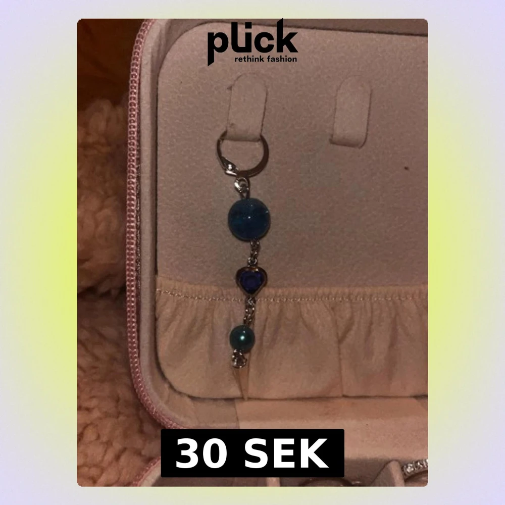 Unikt hängande örhänge med stora och små blå pärlor, ett hjärtformat blått smycke i mitten och en liten silverfärgad spets längst ner. Örhänget har silvrig krok och kedja. Perfekt för dig som gillar färgstarka accessoarer.