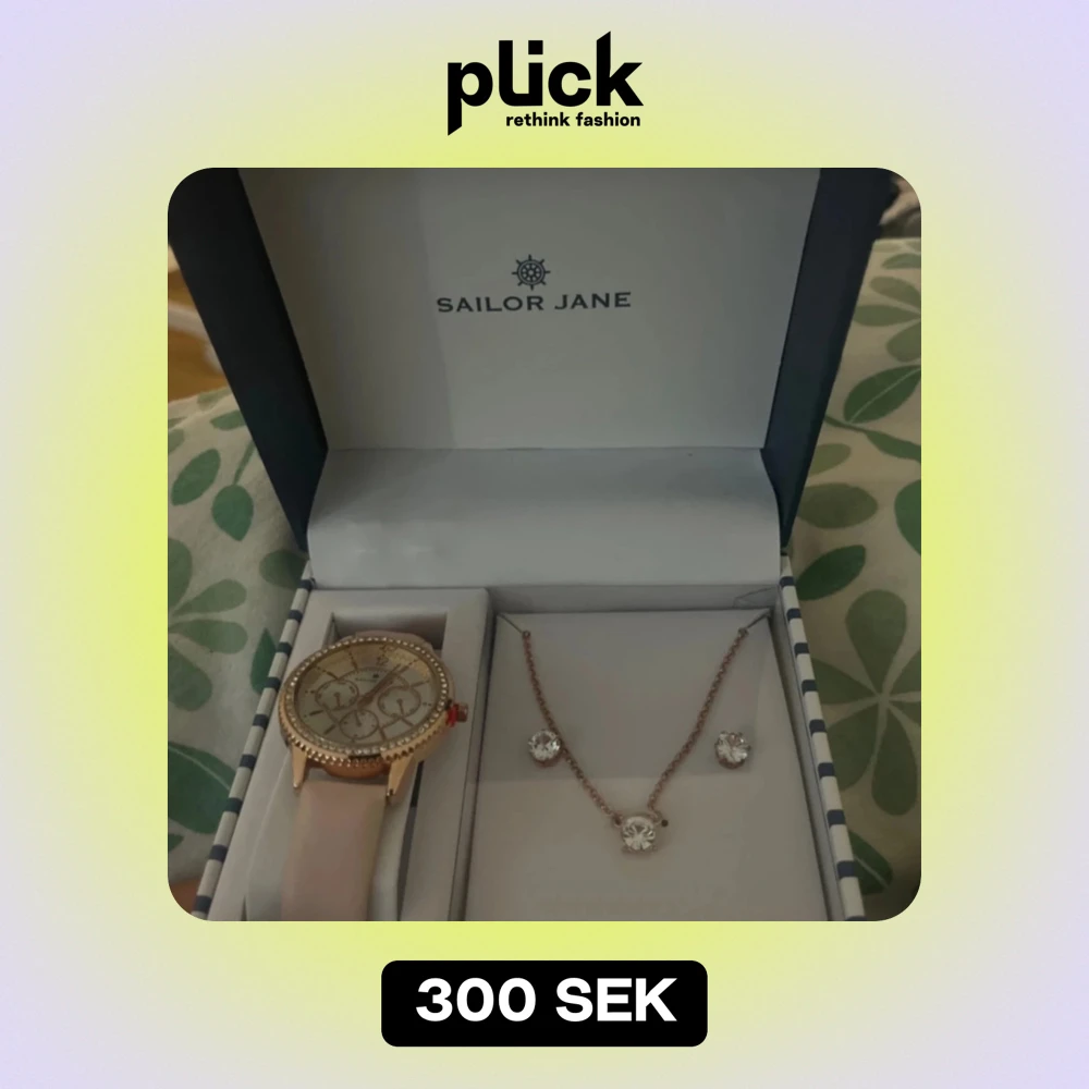 Elegant smyckeset från Sailor Jane med en stilren klocka i guld och ett matchande halsband med örhängen. Klockan har en ljus urtavla och ett guldarmband, medan halsbandet och örhängena har glittrande stenar. Perfekt för både vardag och fest!