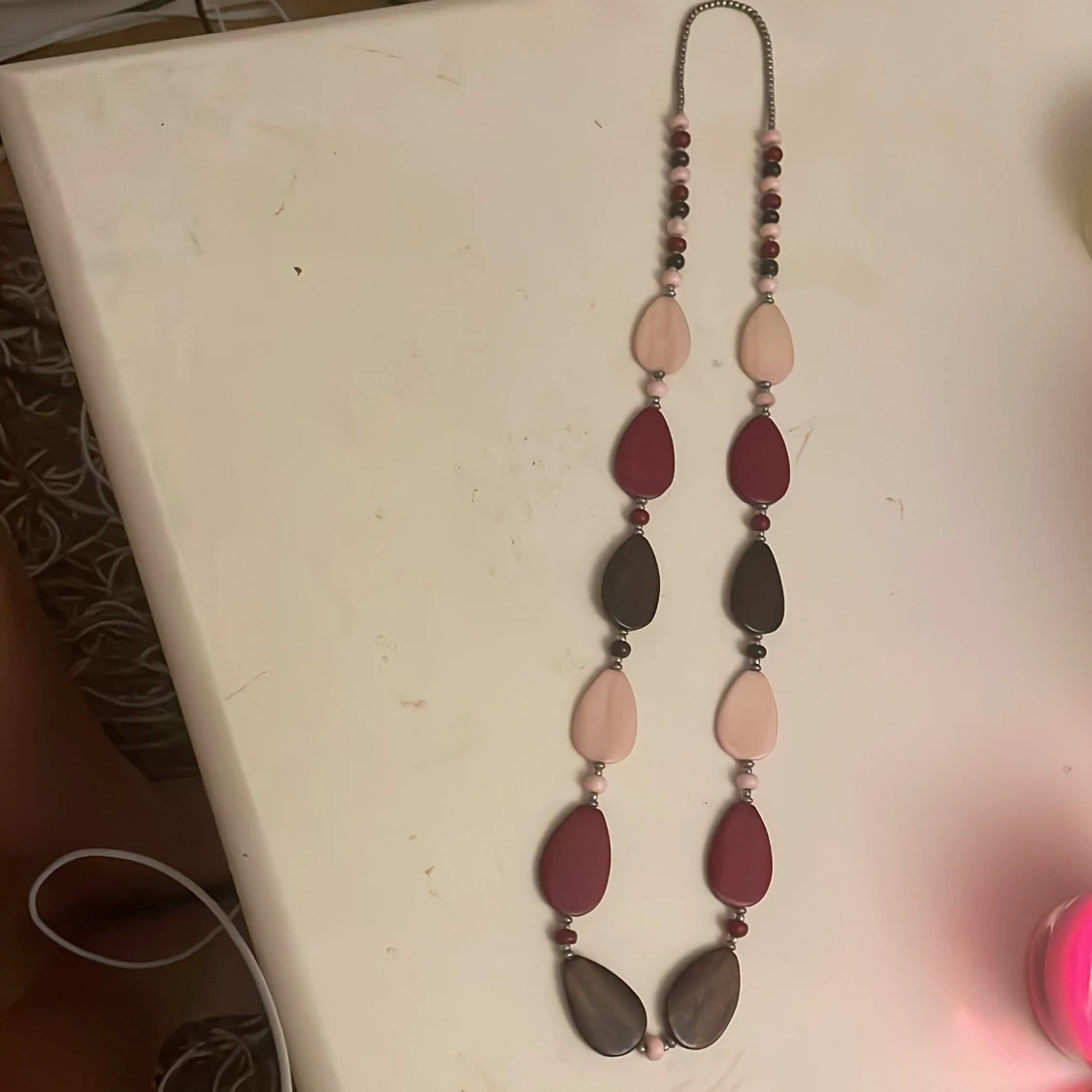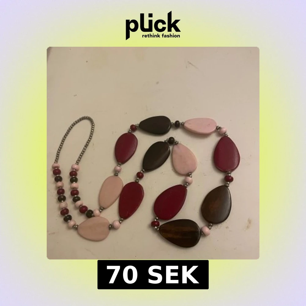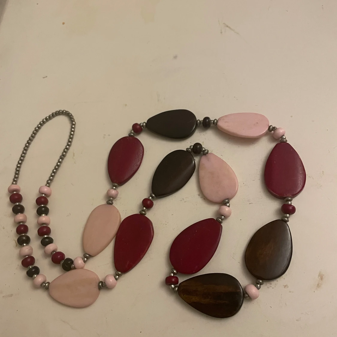 Unikt halsband med stora platta droppformade pärlor i vinrött, rosa och brunt. Pärlorna är varvade med mindre runda pärlor i matchande färger. Halsbandet har en bohemisk vibe och är perfekt för att ge din outfit en färgklick. Längd ca 45 cm