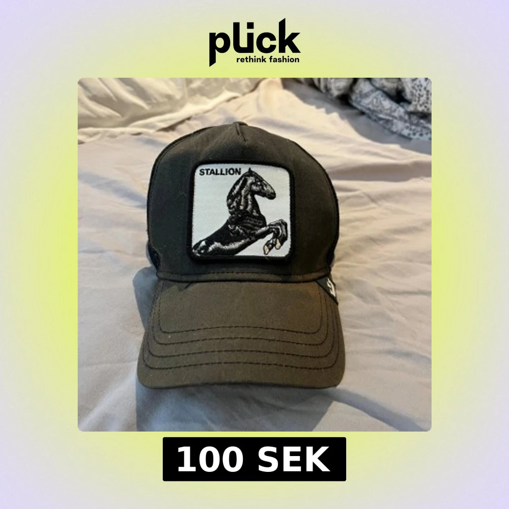 Svart truckerkeps från Goorin Bros med broderad patch framtill med en svart häst och texten 'Stallion'. Kepsen har justerbar snapback och mesh baktill för extra ventilation. Perfekt accessoar för en cool och sportig look.