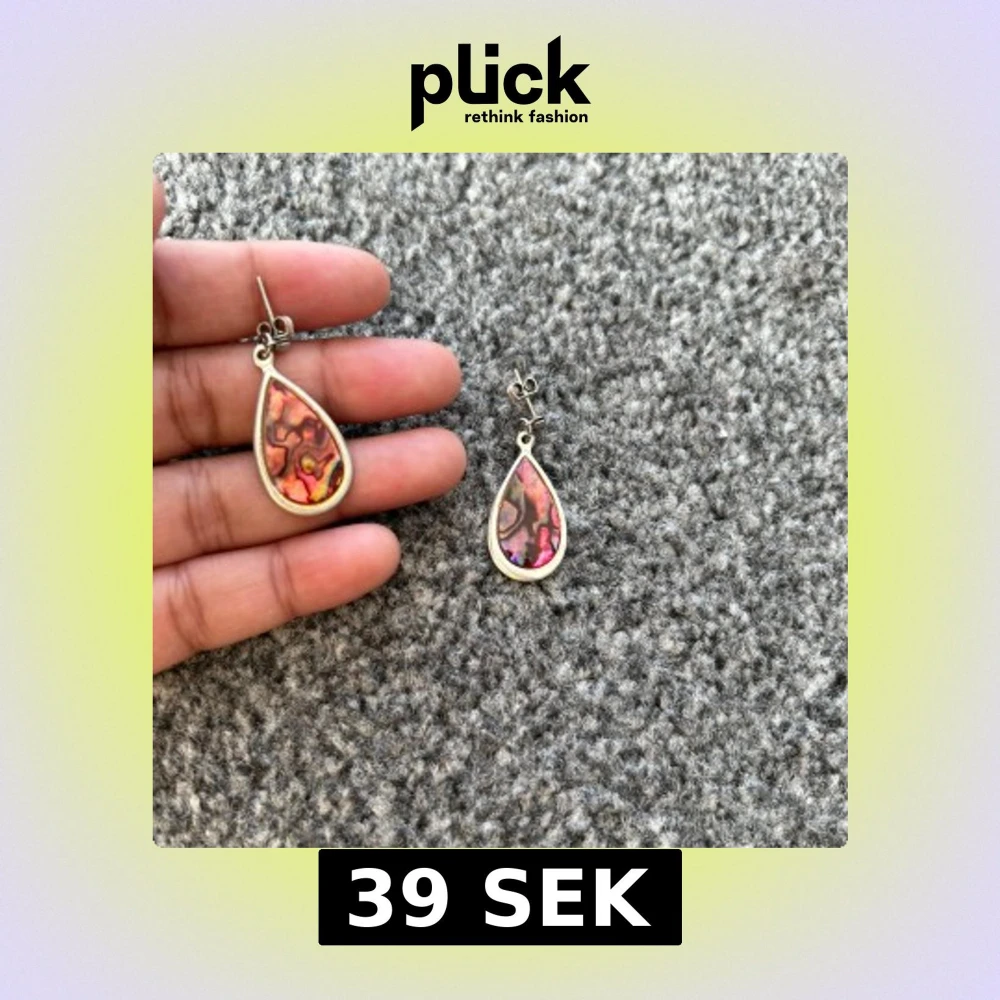 Snygga droppformade örhängen med ett färgglatt mönster i rosa, lila och orange toner. De har en silverfärgad kant och är perfekta för att ge en färgklick till din outfit.