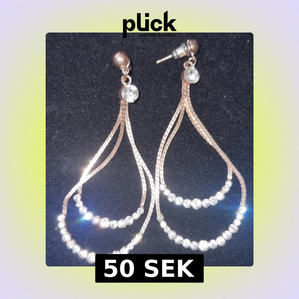 Säljer ett par snygga örhängen i guldton med glittrande strassdetaljer. De har en droppformad design med två böjda kedjor och gnistrande stenar längs nedre kanten. Perfekt för dig som gillar att sticka ut med accessoarer.