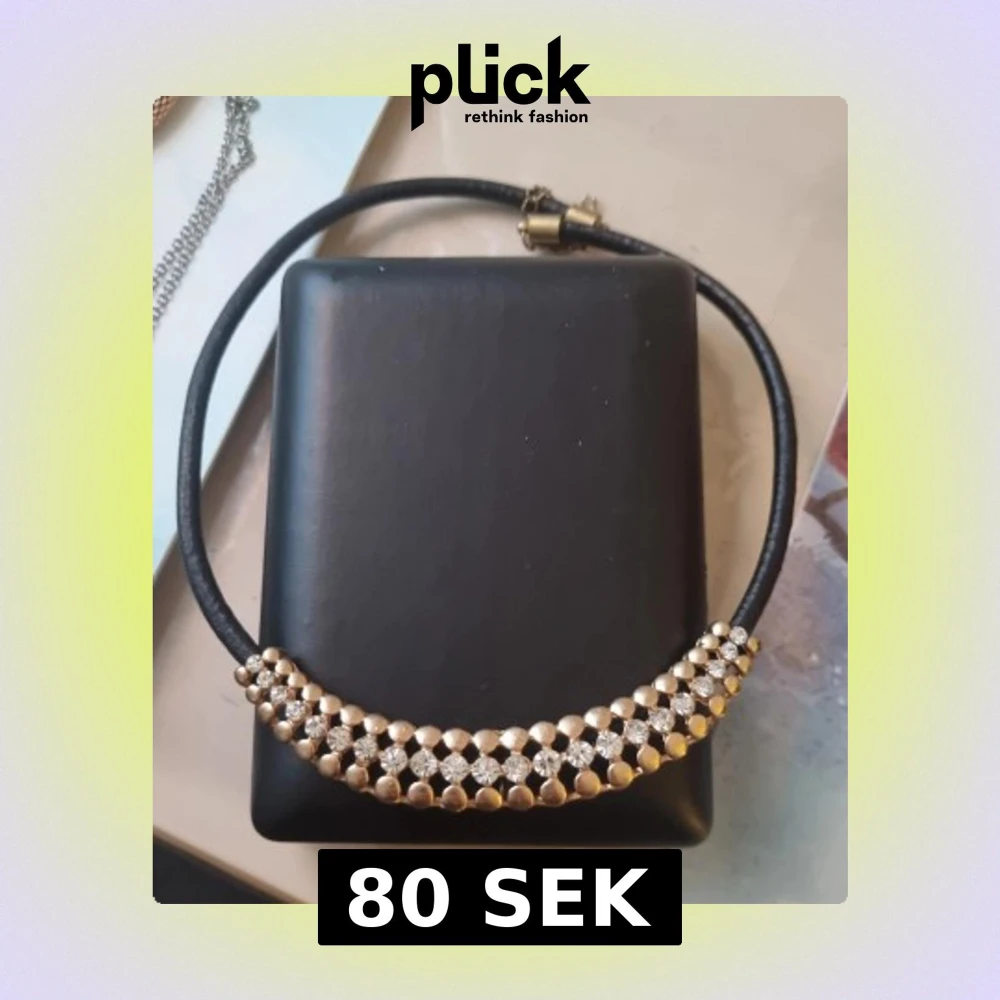 Snyggt halsband med svart band och dekorativt parti i guldton med glittrande strass. Designen är modern med runda guldfärgade detaljer och gnistrande stenar som ger extra bling. Perfekt för att lyfta din outfit med lite extra glamour.