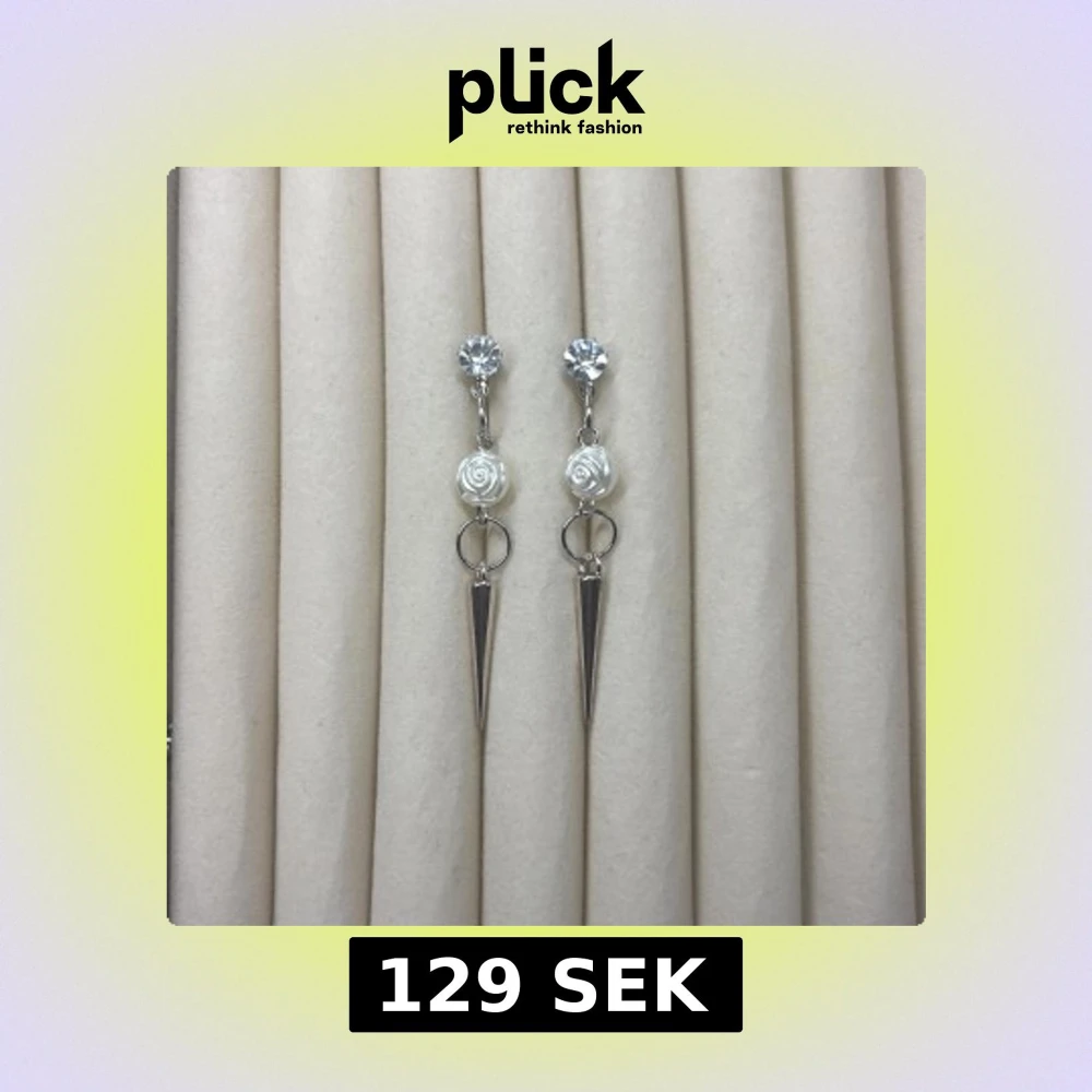 Snygga örhängen i silverfärg med glittrande sten upptill, vit ros i mitten och en spetsig hängande detalj. Perfekta för att ge din look en cool och unik touch.