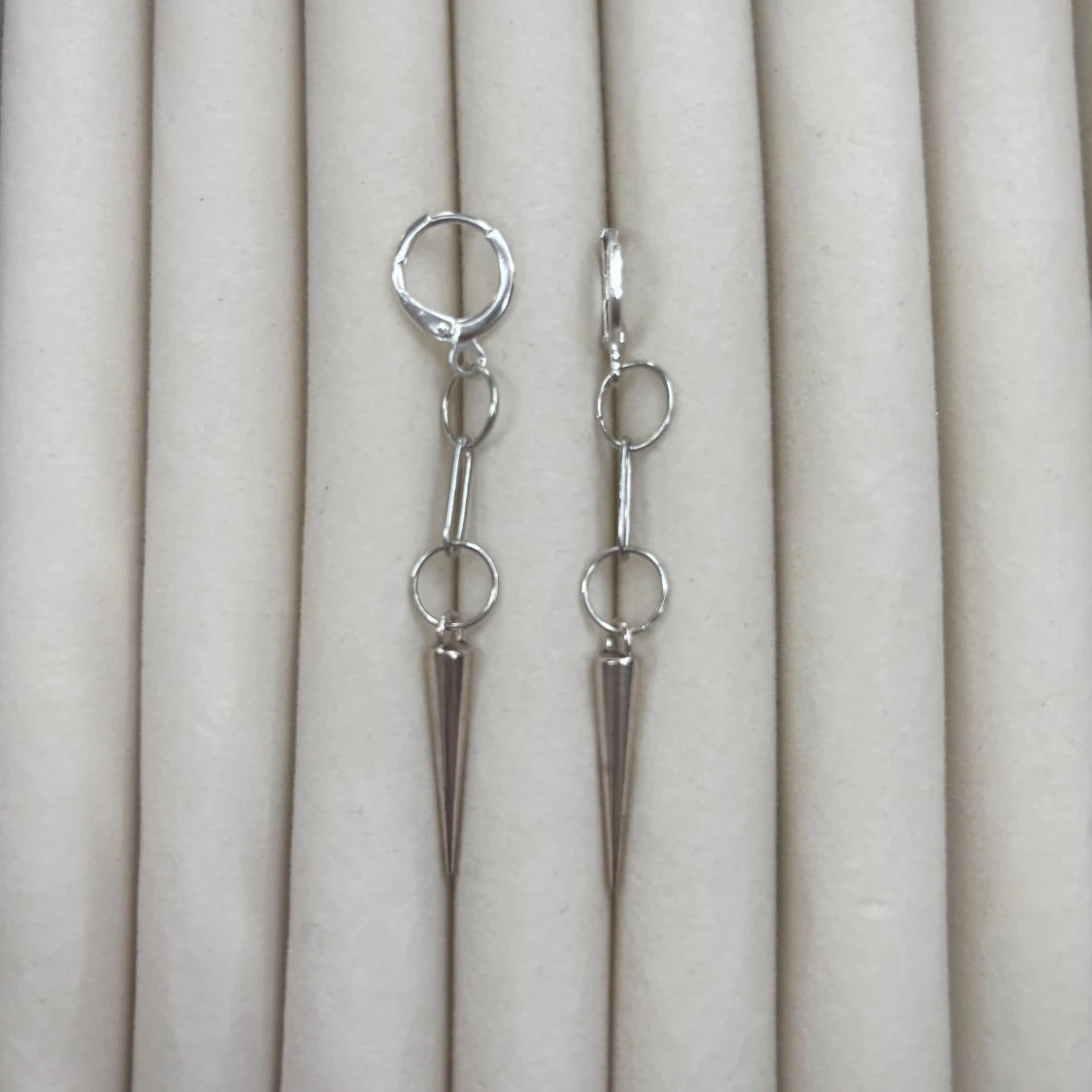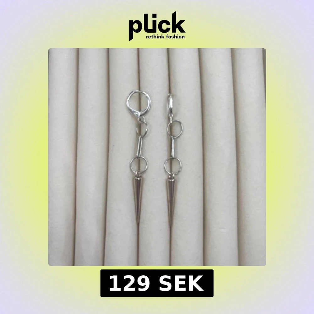 Säljer ett par coola silverfärgade örhängen med lång, smal design och spetsiga hängen. Örhängena har ringdetaljer och ger en edgy känsla till din stil. Perfekta för dig som gillar unika accessoarer!