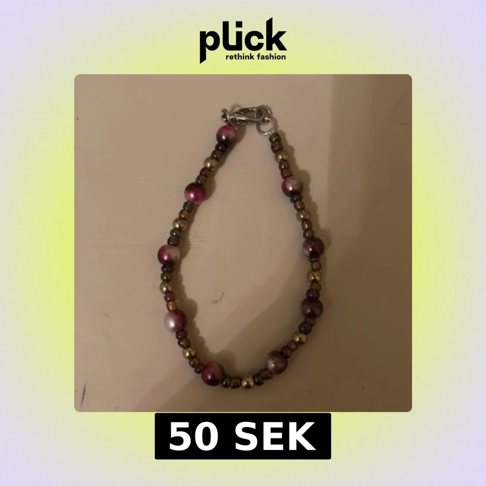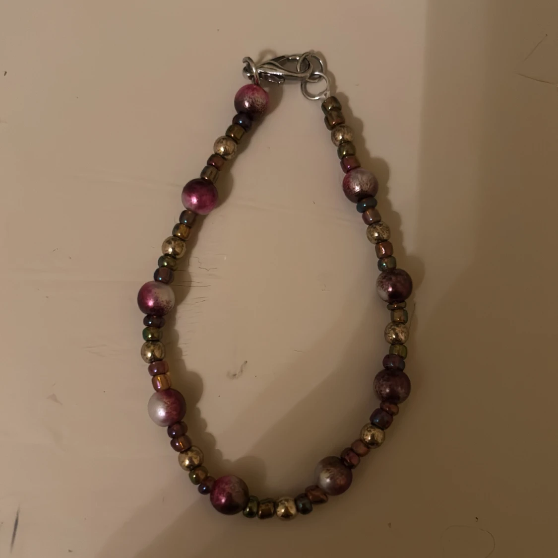 Säljer ett färgglatt armband med pärlor i olika nyanser av lila, guld och metalfärgat. Armbandet har en praktisk karbinhake som gör det enkelt att ta på och av. Ej nickelfritt!
