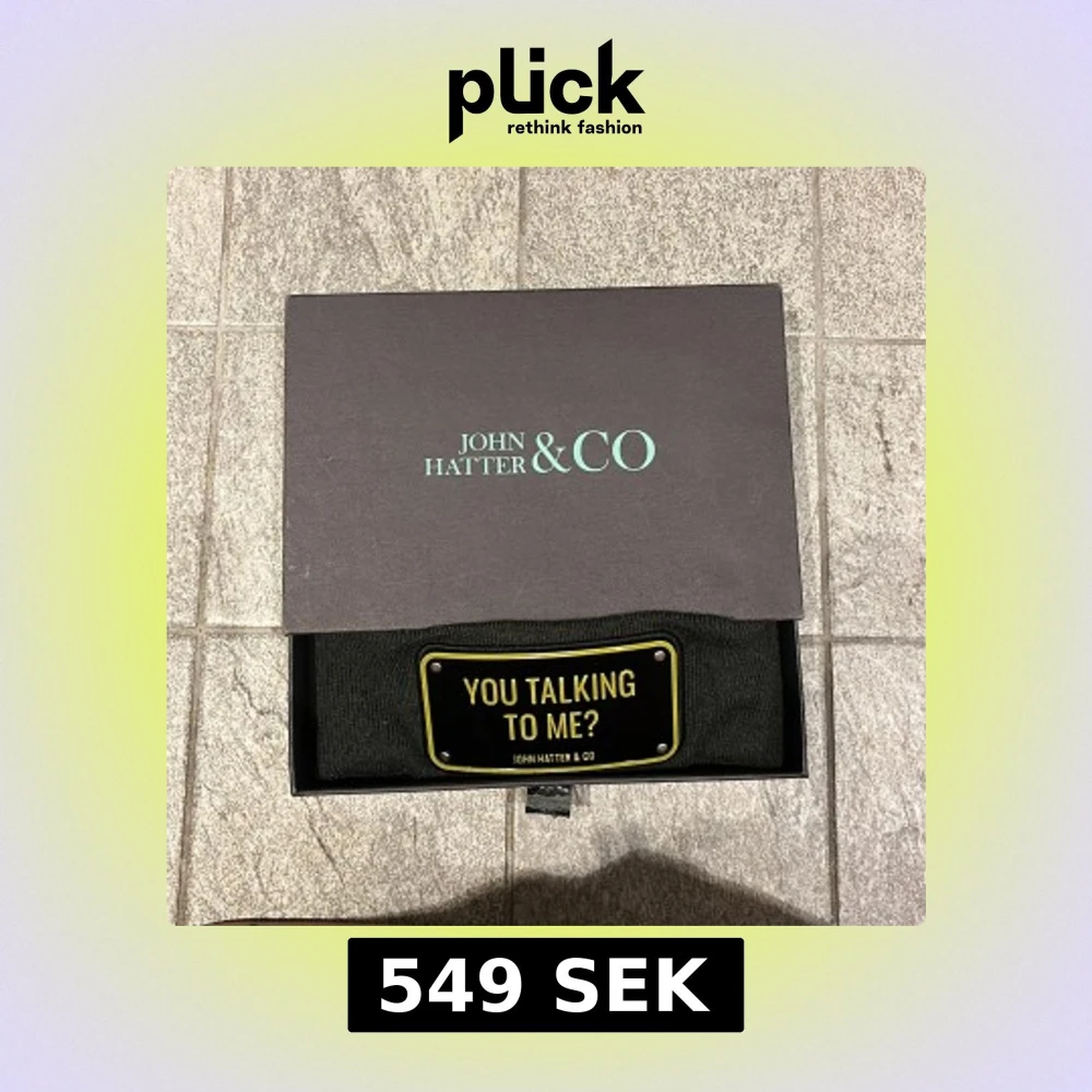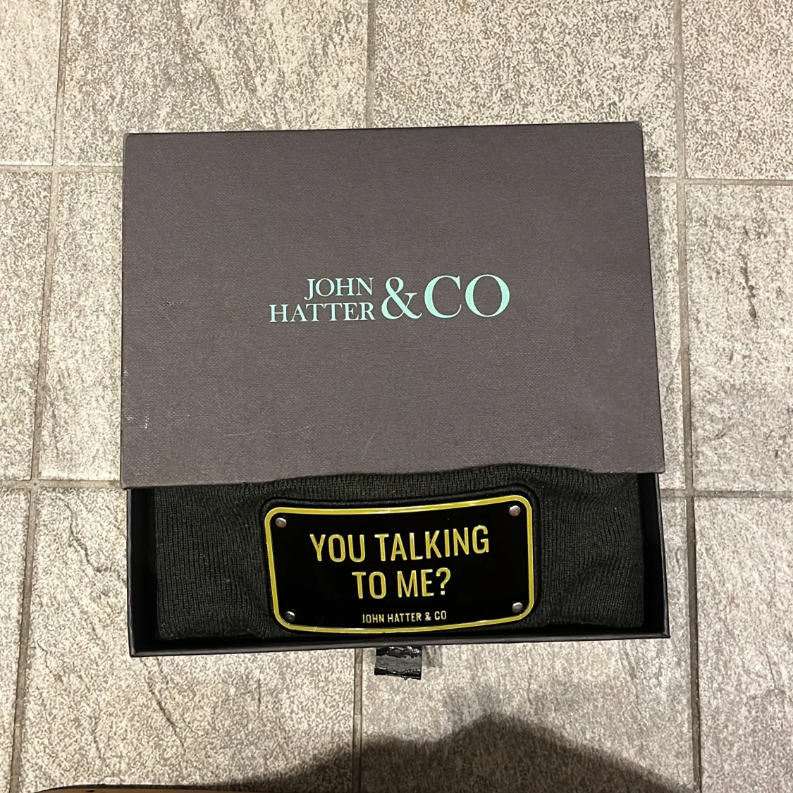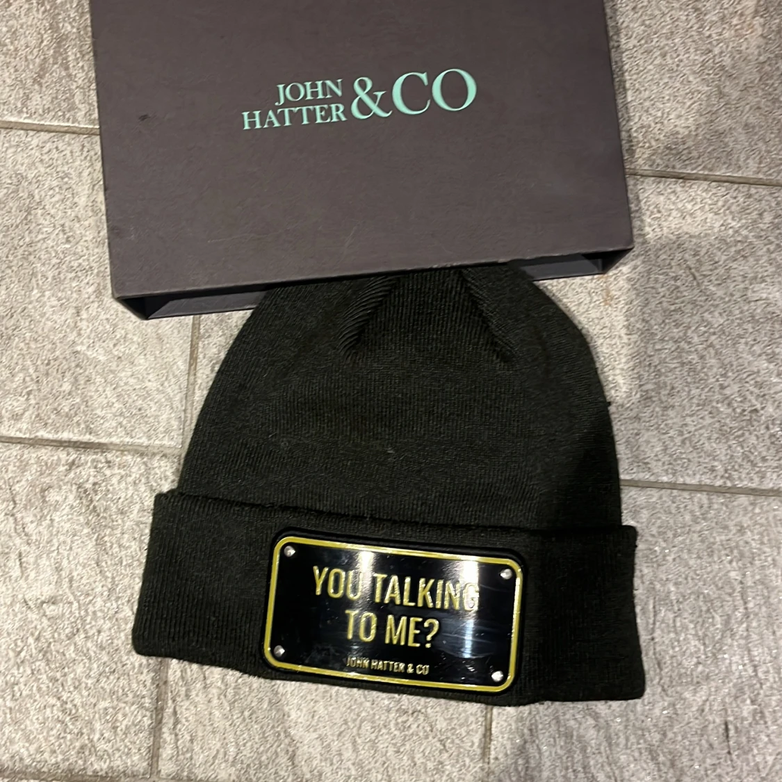 Svart mössa från John Hatter & Co med uppvikt kant och en metallskylt framtill där det står 'YOU TALKING TO ME?'. Skylten har guldfärgade detaljer som ger en cool och edgy vibe. Perfekt för dig som vill sticka ut med din stil.