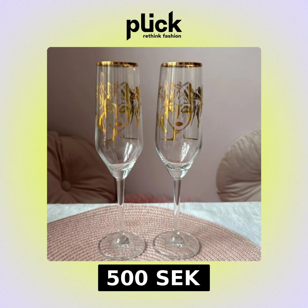 Två eleganta champagneglas med guldkant och konstnärligt ansiktsmotiv i guld. Perfekta för speciella tillfällen och ger en lyxig känsla till dukningen. Från Carolina gynnings serie ” Slice of Life Gold”