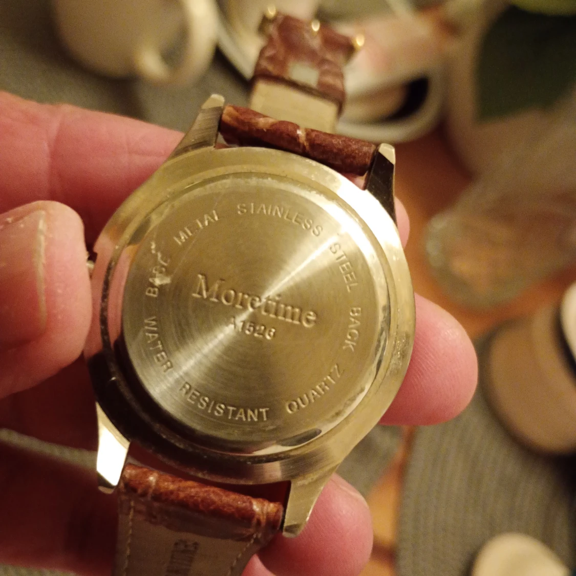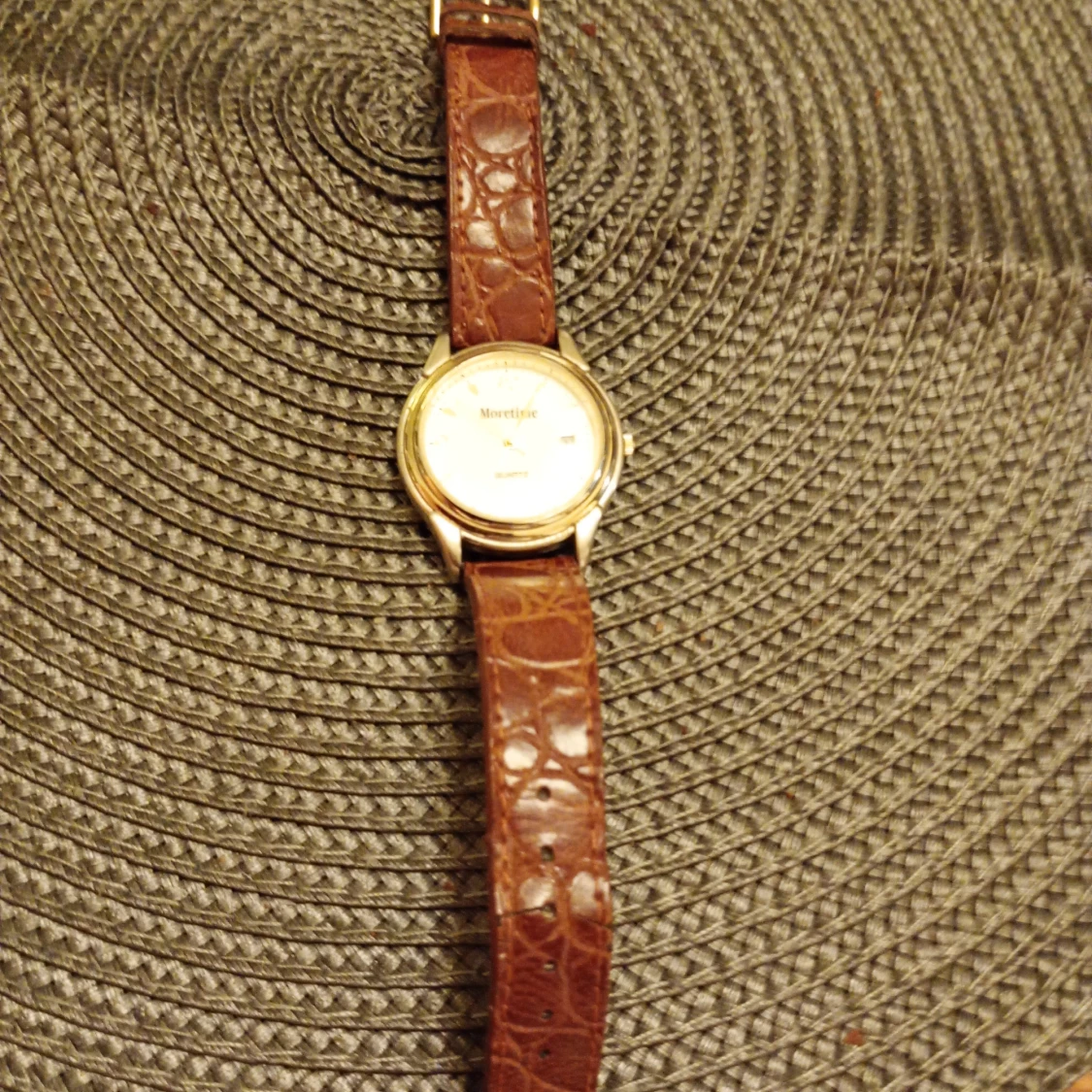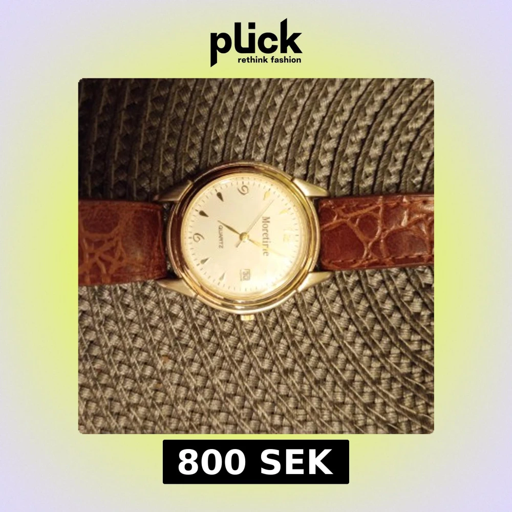 Stilren klocka från Moretime med rund, guldig boett och vit urtavla. Brunt läderarmband med krokopräglat mönster. Urtavlan har datumvisning och tydliga siffror. Quartz-urverk och baksida i rostfritt stål. Nytt batteri behövs.