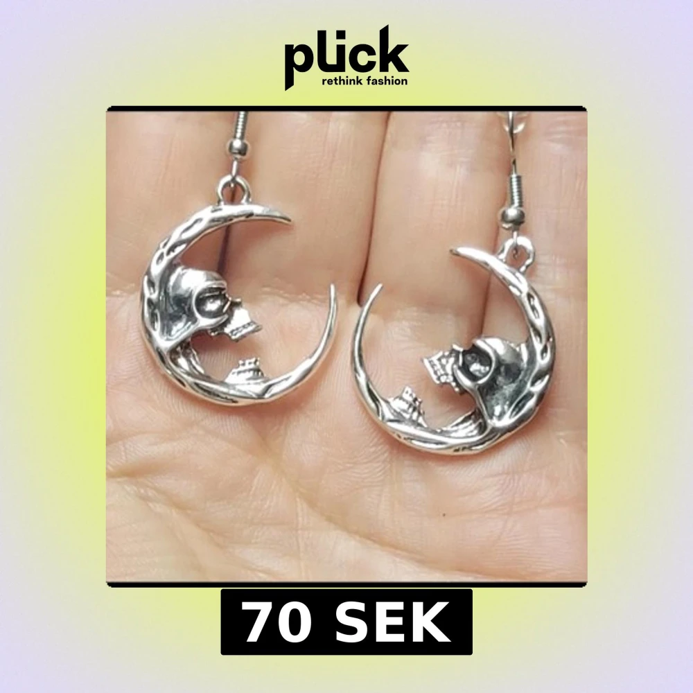 Helt nya Unika silvriga örhängen i form av en halvmåne med detaljerad dödskalle i mitten. Cool design som sticker ut och passar perfekt för dig som gillar alternativ stil. Hängande modell med metallkrok för enkel användning.