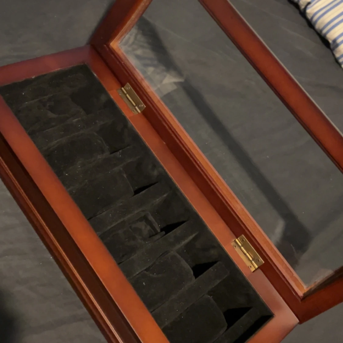 Stilren klocklåda i brunt trä med tjockt plastlock och svart sammetsinredning. Perfekt för att förvara och visa upp dina klockor på ett snyggt sätt. Lådan har plats för 6 klockor och ger en lyxig känsla till rummet.