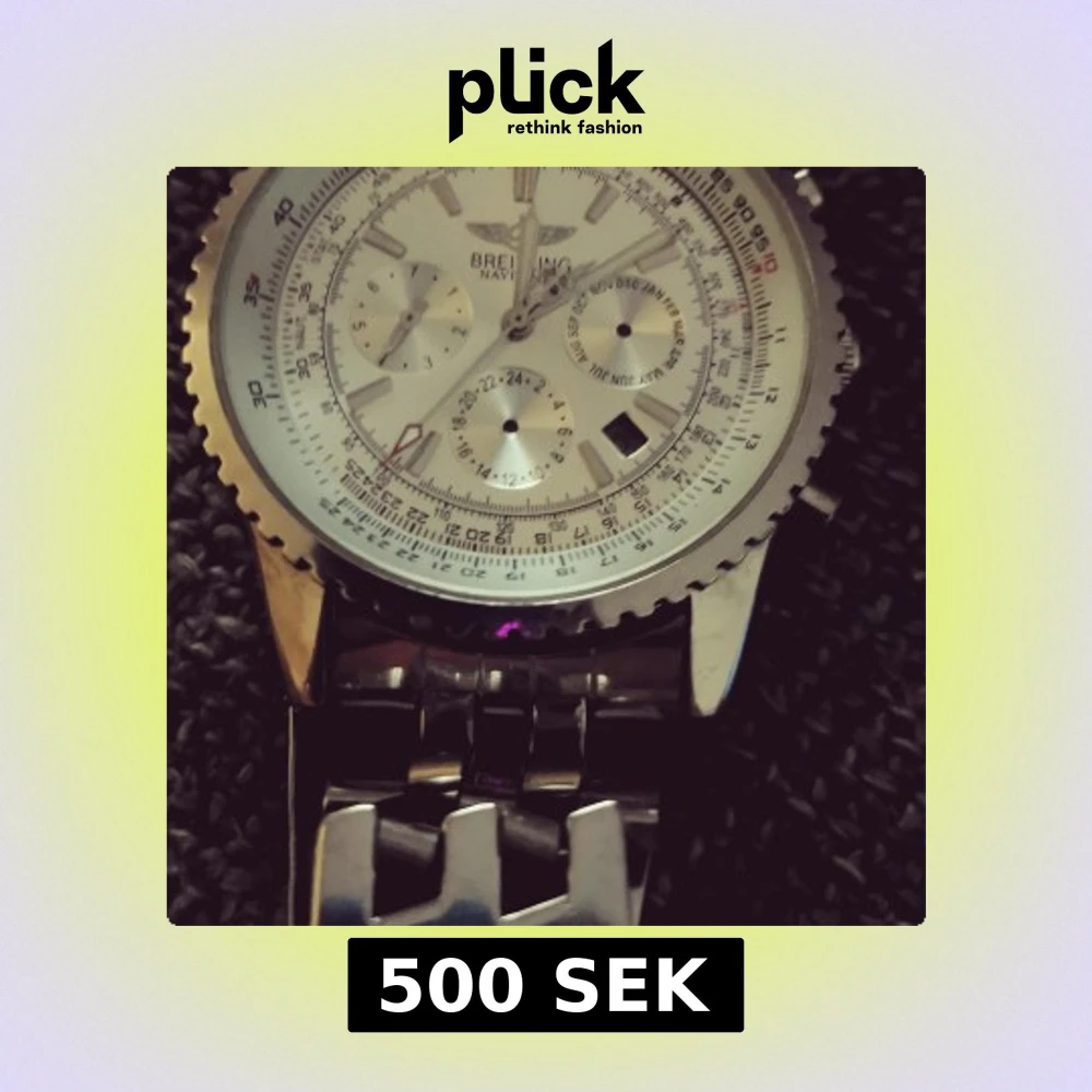 Säljer en stilren Breitling Navitimer med silverfärgad urtavla och länkarmband i rostfritt stål. Klockan har flera subdials, datumvisning och tydliga indexmarkeringar. Klassisk rund boett och detaljerad bezel för en sportig och lyxig känsla.