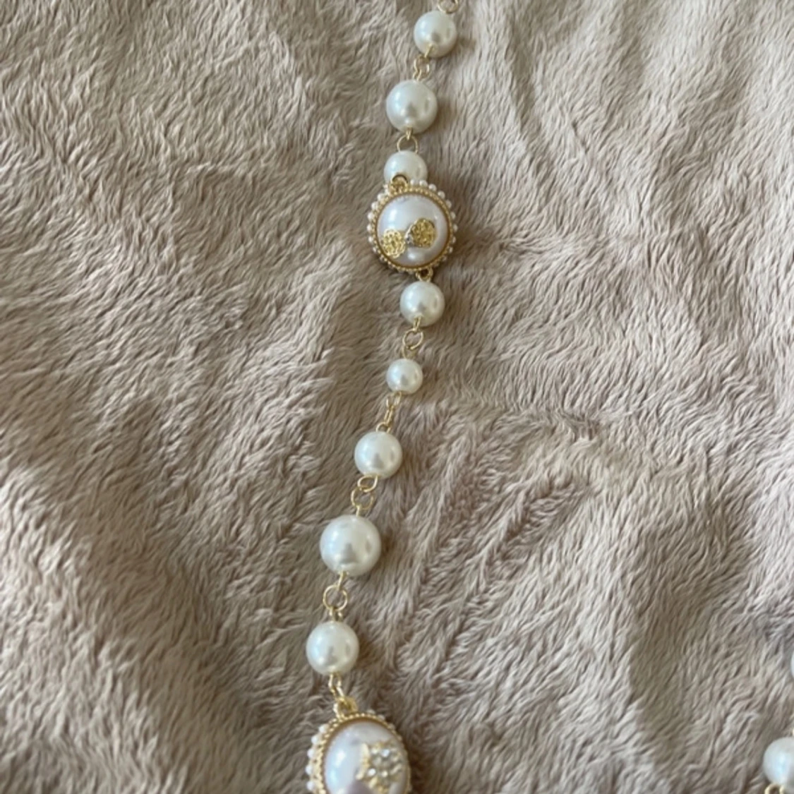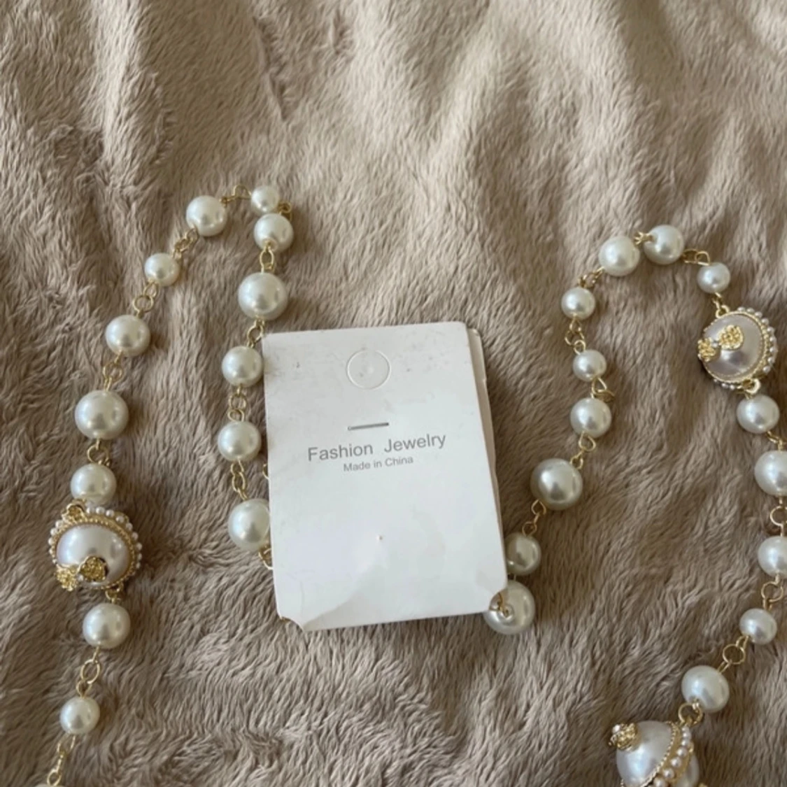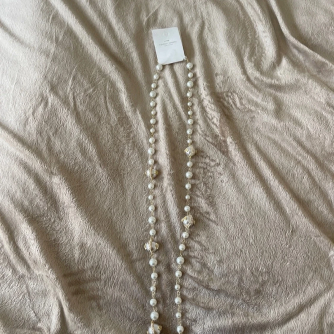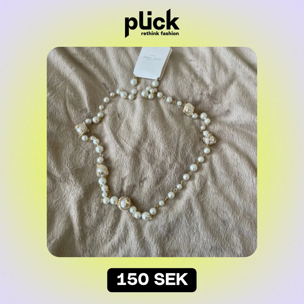 Elegant långt pärlhalsband med vita pärlor och gulddetaljer. Perfekt för att ge en touch av glamour till din outfit. Halsbandet har en klassisk design med större dekorerade pärlor som ger det en unik stil. Passar både till vardags och festliga tillfällen.