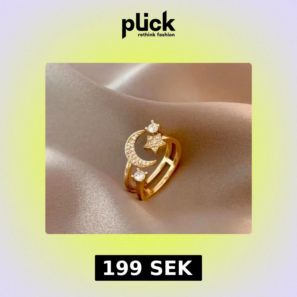 Unik guldig ring med dubbla band, dekorerad med gnistrande stenar i form av en måne och en stjärna samt två runda stenar. Perfekt för dig som gillar detaljer och vill ha något som sticker ut. Ringen har en glittrig finish och känns riktigt trendig.This is new perfect for gift and will receive freebies when you order now.