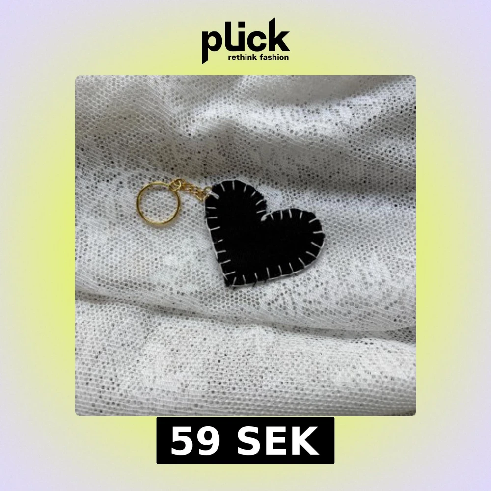 Fin svart hjärtformad charm med vita sömmar. Den har en guldfärgad ring för att fästa på nycklar eller väskor. Perfekt som en söt accessoar eller present.