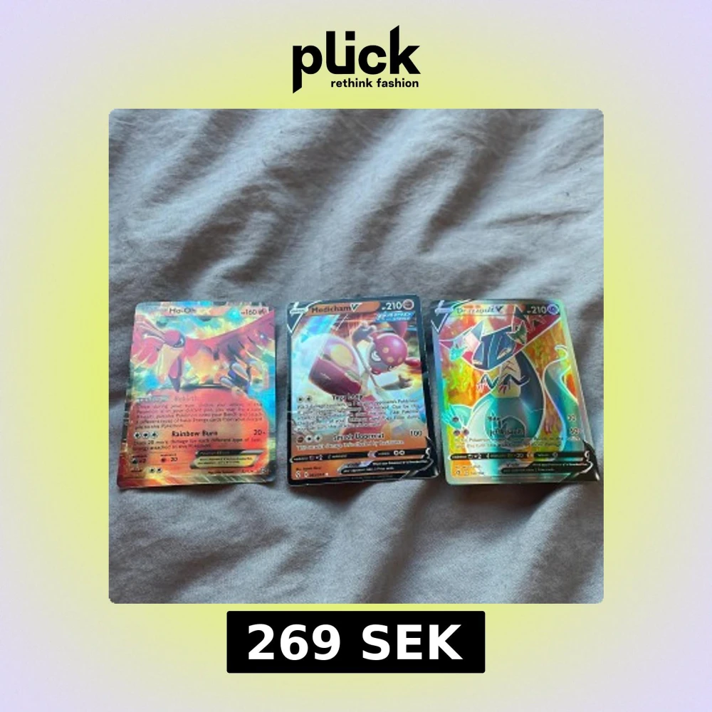 Tre Pokémonkort med holografisk design: Ho-Oh V med 160 HP, Medicham V med 210 HP och Dragapult V med 210 HP. Korten har färgglada och detaljerade illustrationer som framhäver varje Pokémon. Perfekt för samlare eller spelare som vill förstärka sin kortlek. Obs igen frakt!