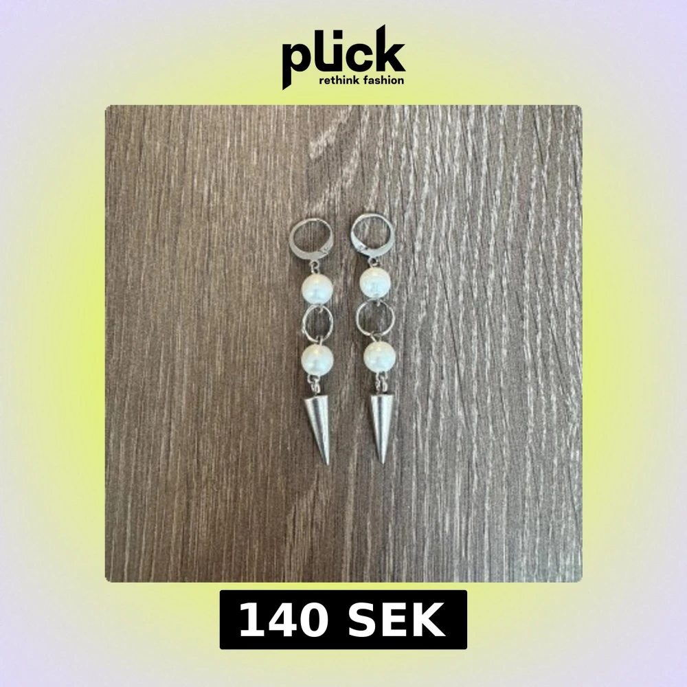Snygga örhängen med två vita pärlor i silverfärg. Dem är handgjorde och nickelfria. Perfekta för att ge en edgy touch till din outfit.