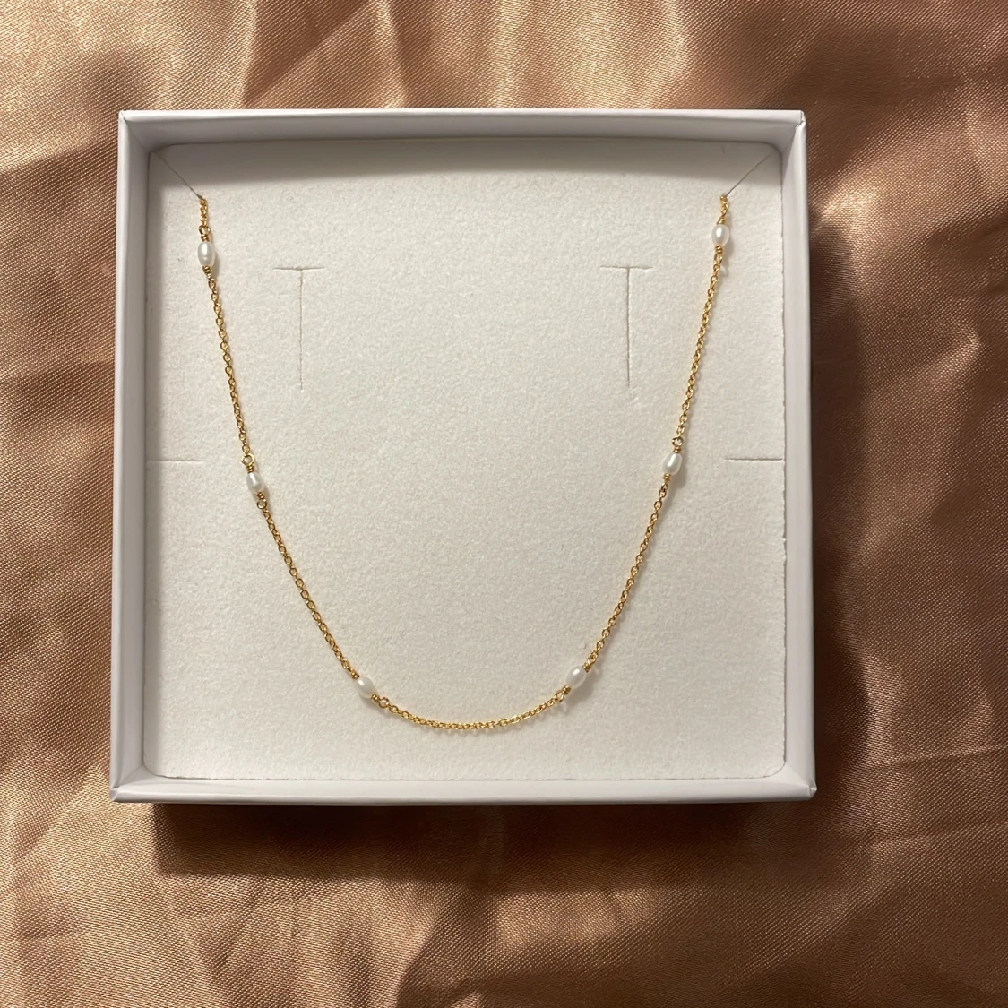 Elegant guldhalsband från Syster P med små vita pärlor. Perfekt för att ge en touch av lyx till din outfit. Halsbandet kommer i en stilren förpackning.