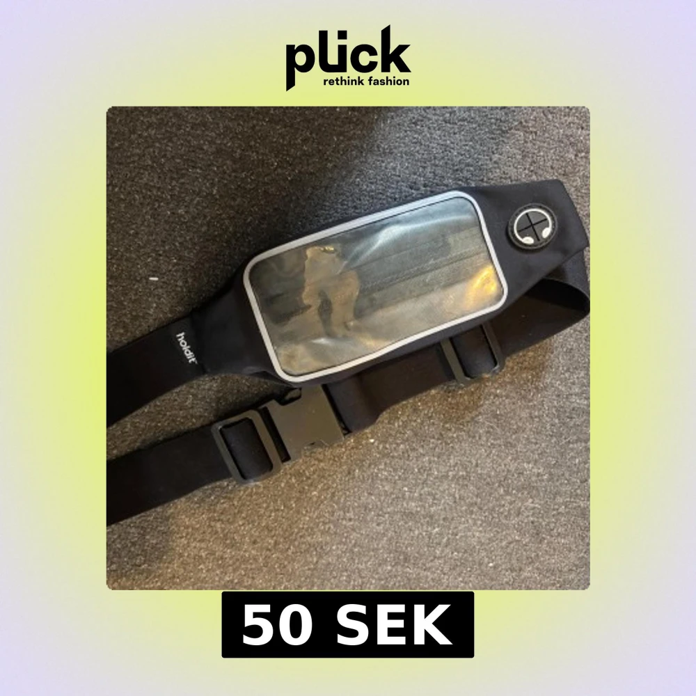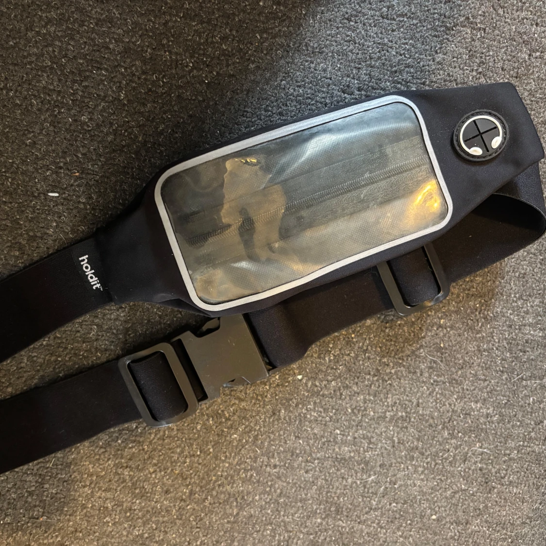 Praktiskt svart träningsbälte från Holdit med genomskinlig ficka för mobil och hörlursuttag. Perfekt för löpning eller träning. Justerbart band med spänne för säker passform.