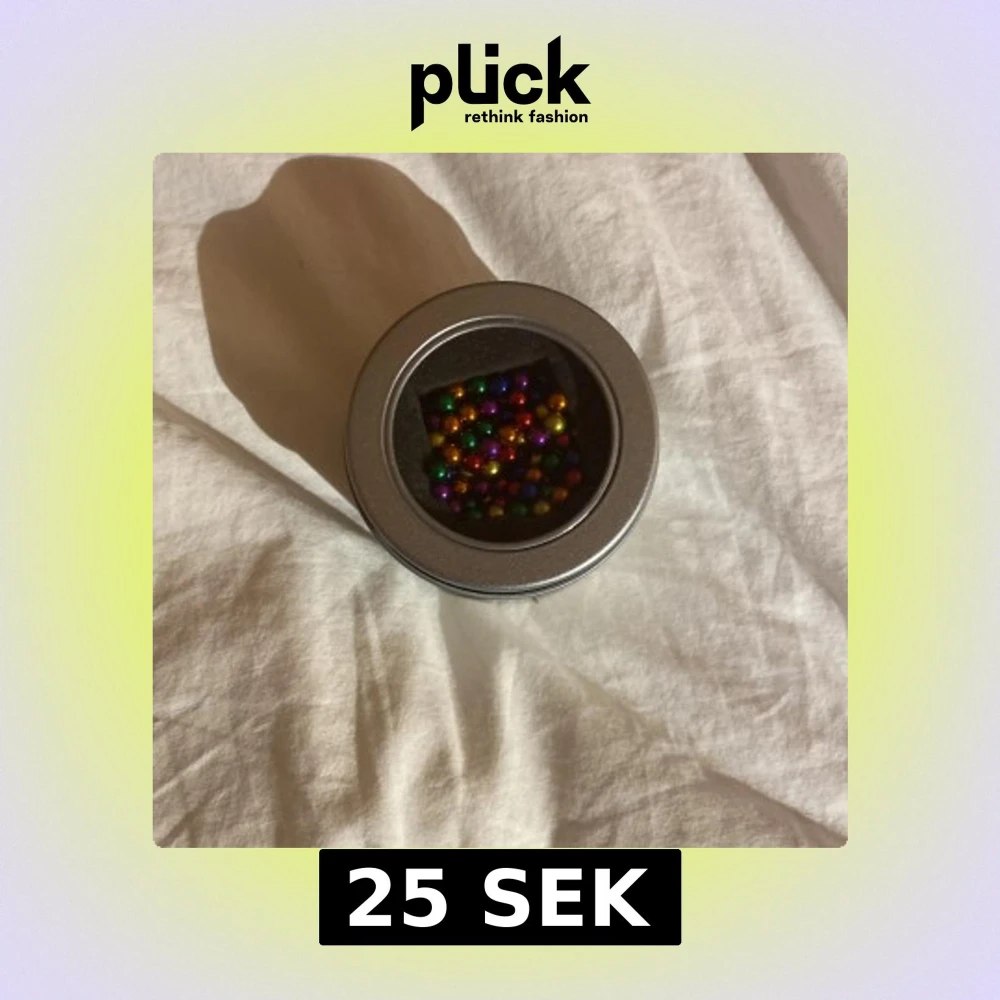 Säljer mass olika magneter med pärlor i olika färger som röd, grön, blå, lila och guld. Dett kommer i en praktisk metallask med genomskinligt lock. Roligt att hålla på med.