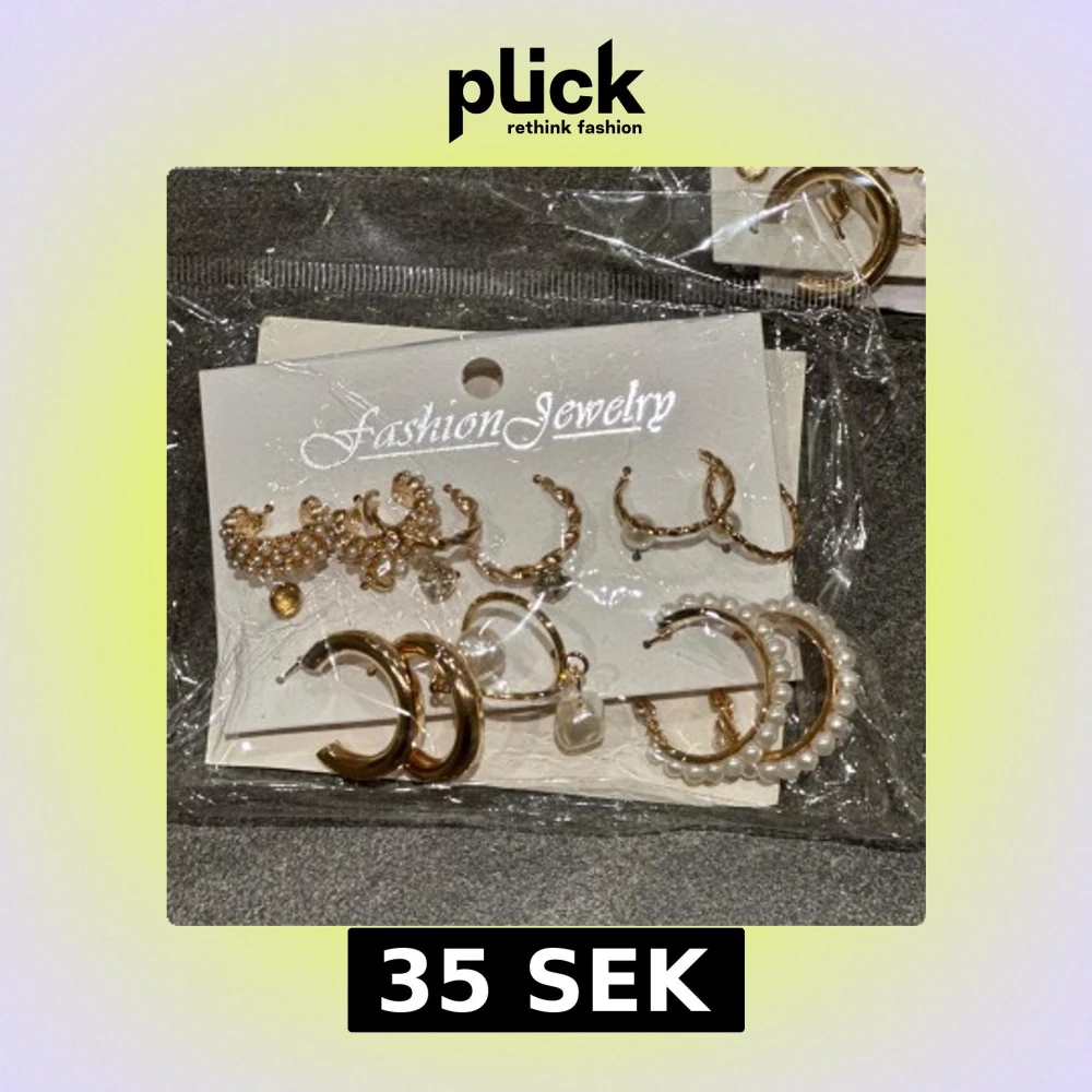 Säljer ett set med örhängen i guld och pärlor. Setet innehåller flera olika stilar, inklusive hoops och små studs, perfekt för att mixa och matcha. Perfekt för att ge din look en elegant touch.