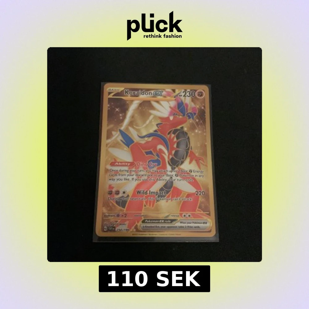 Koraidon ex är ett exklusivt Pokémon-samlarobjekt med coolt holografiskt motiv och kraftfulla attacker som Dino Cry och Wild Impact. Perfekt för dig som älskar Pokémon och vill boosta din samling med en sällsynt och färgstark kortfavorit!