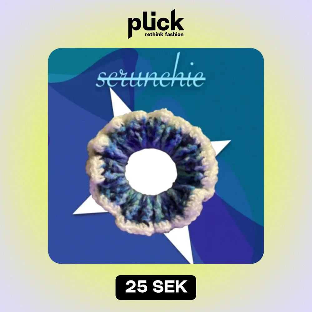 Blå handgjord virkad scrunshie, denna produkt är till för alla hår typer💕