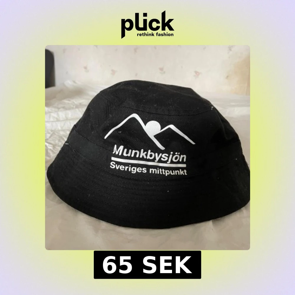 Svart bucket hat i bomull med vit tryckt logga och texten 'Munkbysjön Sveriges mittpunkt' framtill. Klassisk form med bred, nedåtlutande brätte och ljus insida. Perfekt för dig som vill sticka ut med en unik svensk touch.