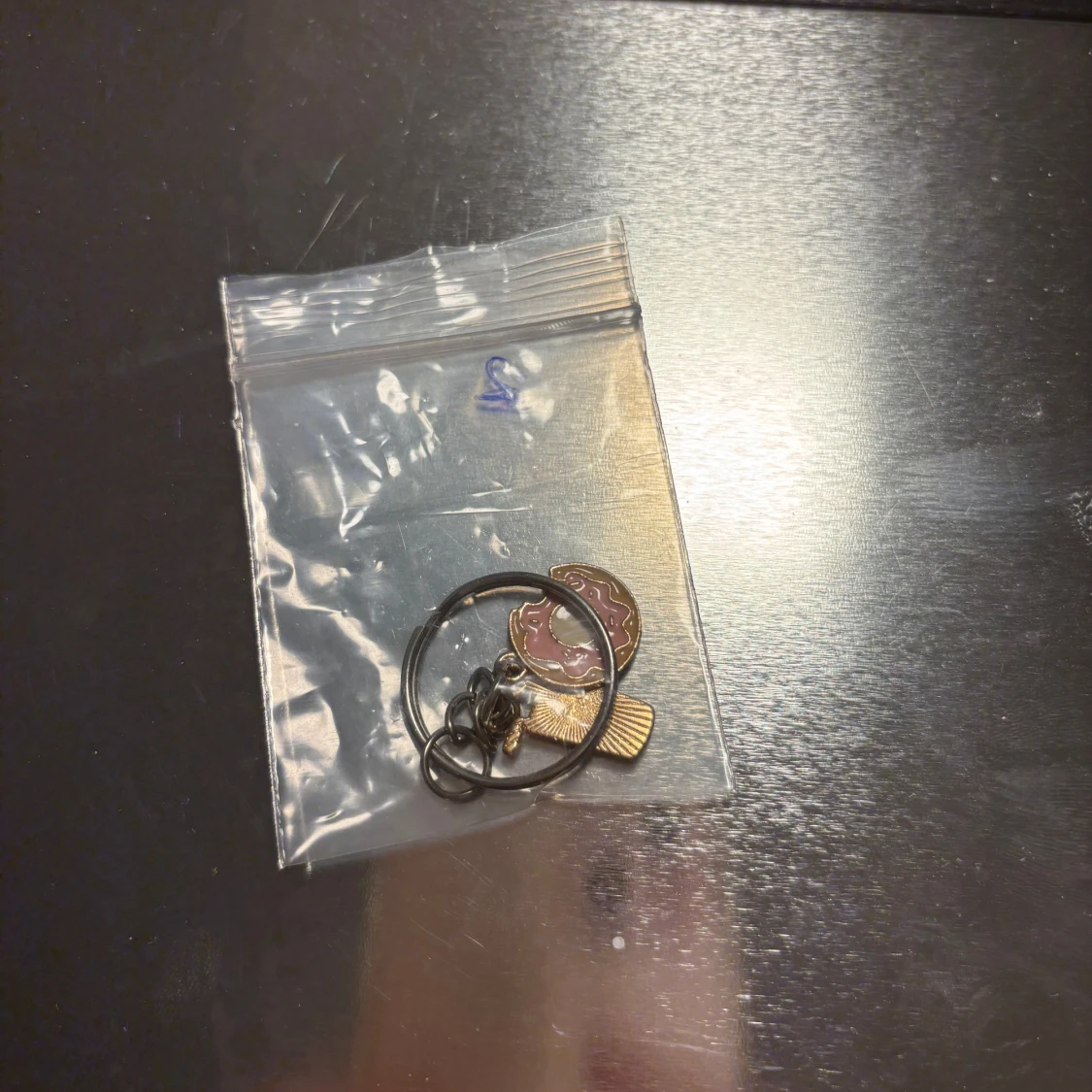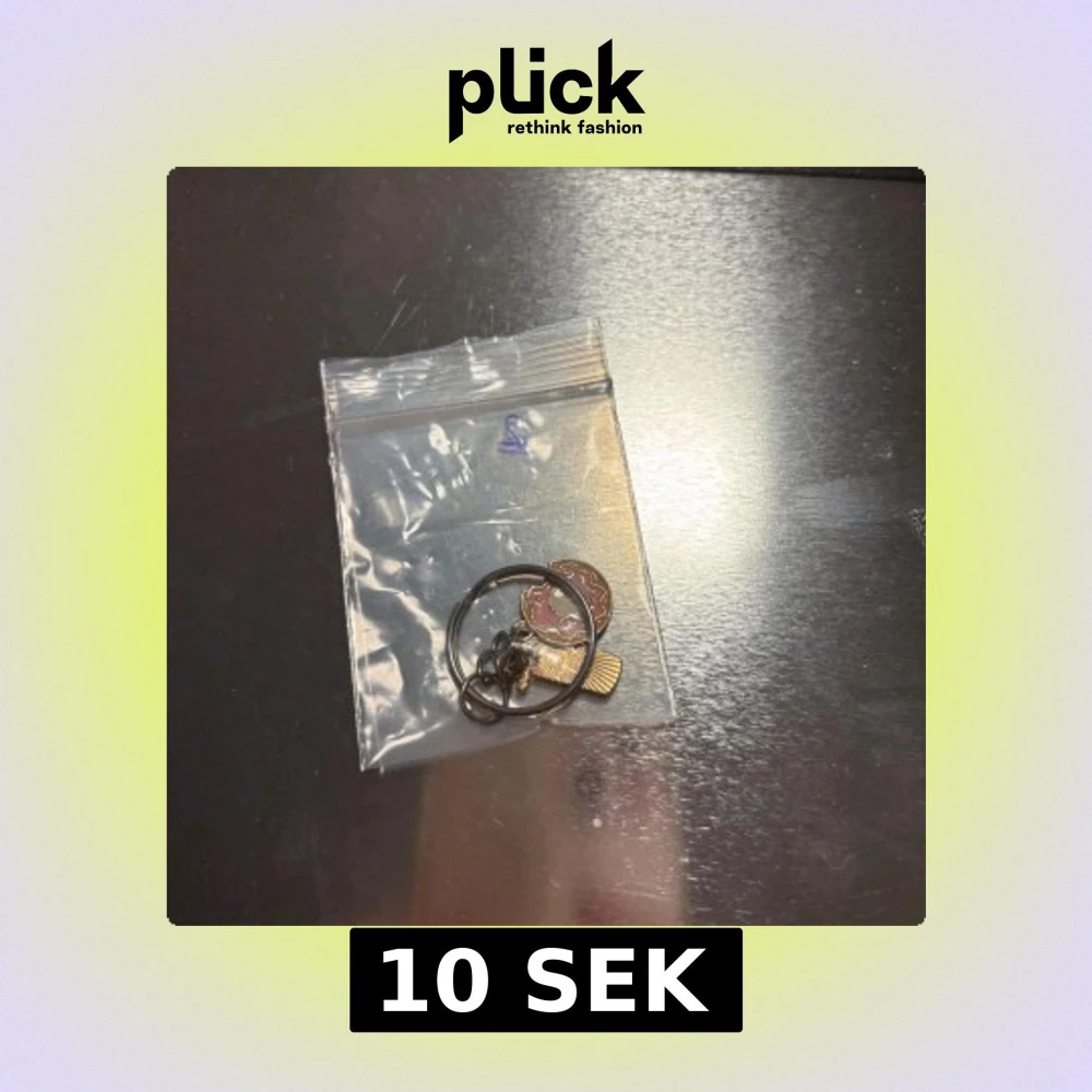 Säljer en nyckelring med flera berlocker, inklusive en rosa blomma och en kam. Perfekt som accessoar för att ge din nyckelknippa lite extra stil.