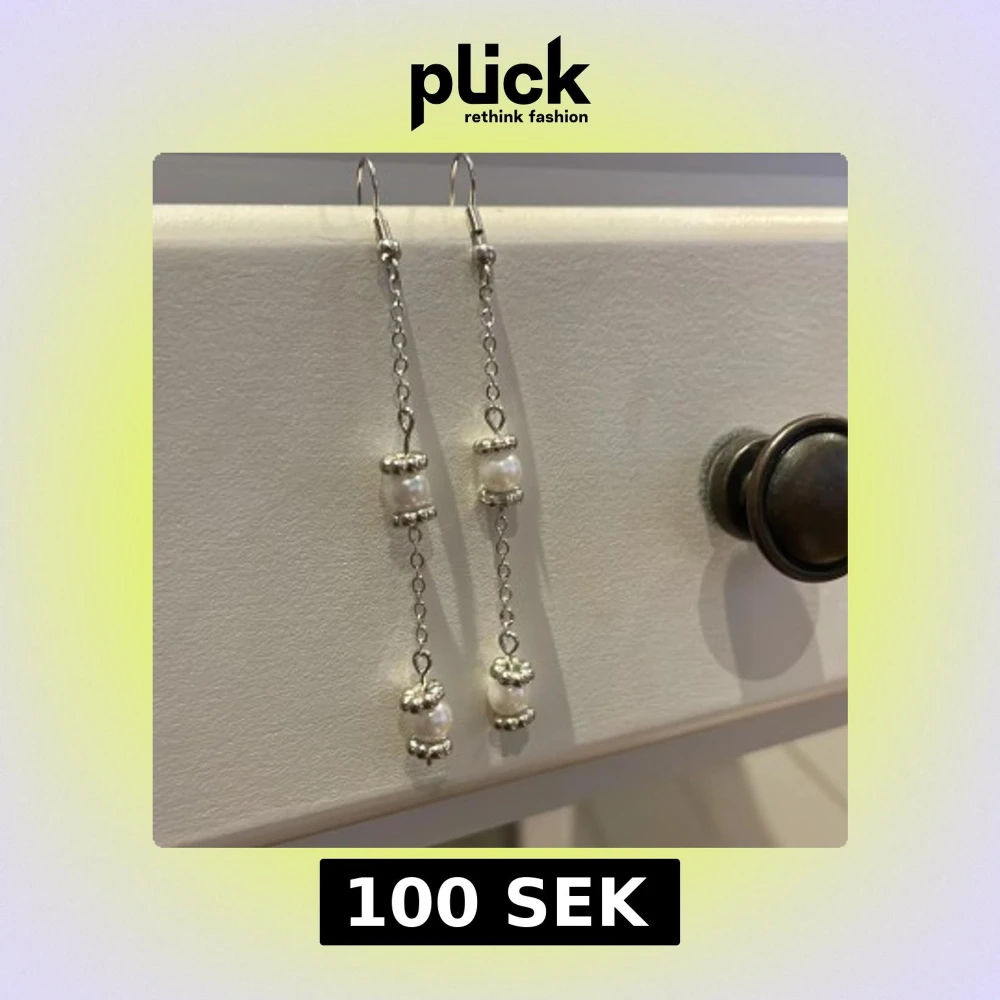 Säljer ett par eleganta, långa örhängen i silverfärgad metall med kedja och vita pärlor. Örhängena har dekorativa detaljer runt pärlorna och ger en stilren och klassisk look.