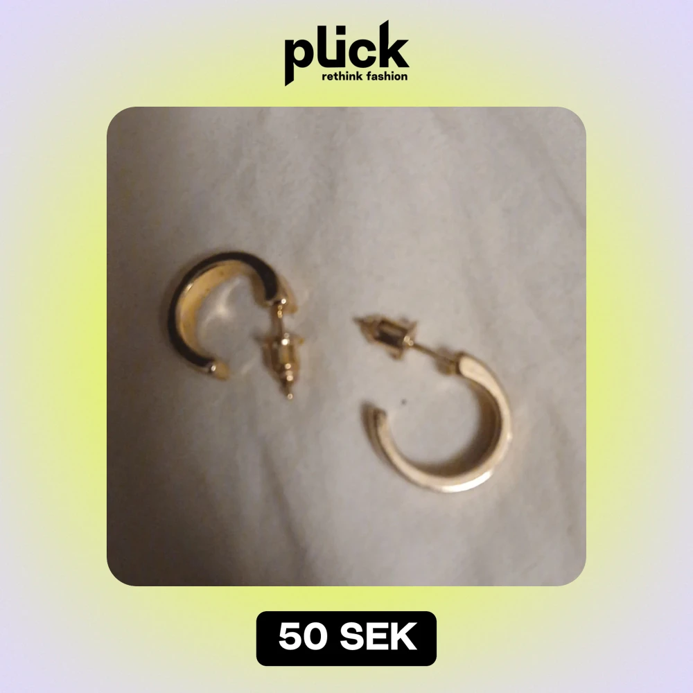 Säljer ett par snygga guldiga örhängen i metall. De är i form av små ringar och har en enkel och stilren design. Perfekta för både vardag och fest! 🥳