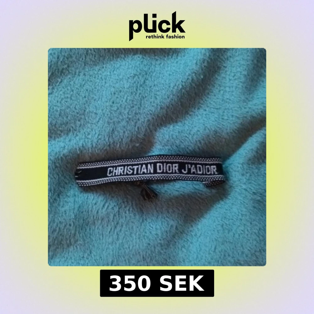 Snyggt svart armband med texten 'Christian Dior J'Adior'. Armbandet har en flätad design med tofsar i ändarna för justering. Perfekt för att ge en stilren touch till din outfit.
