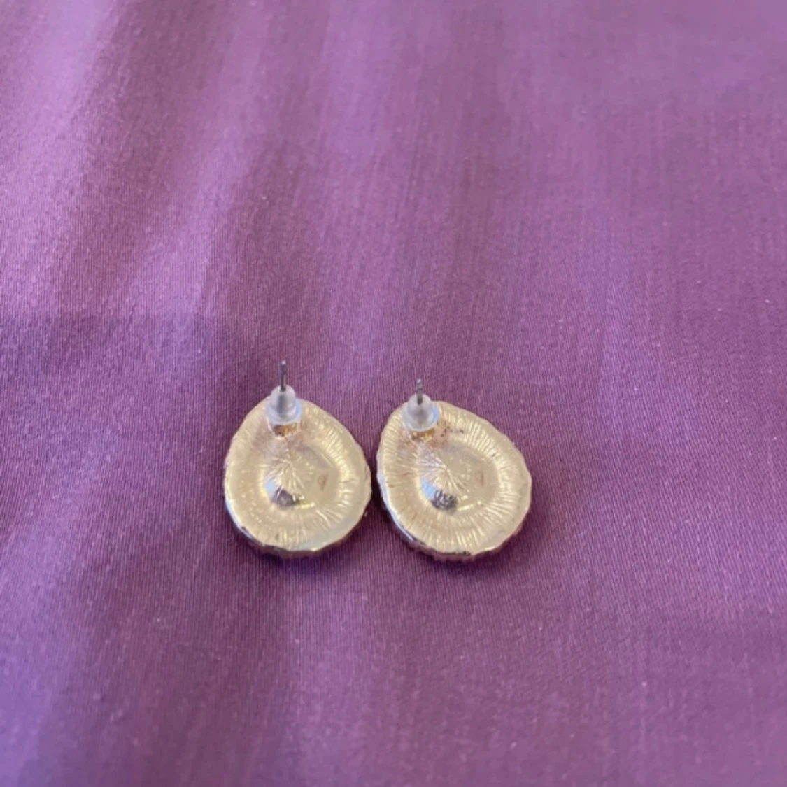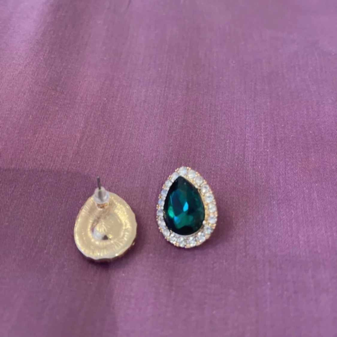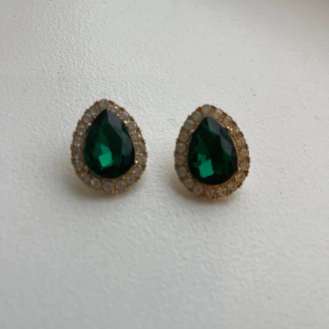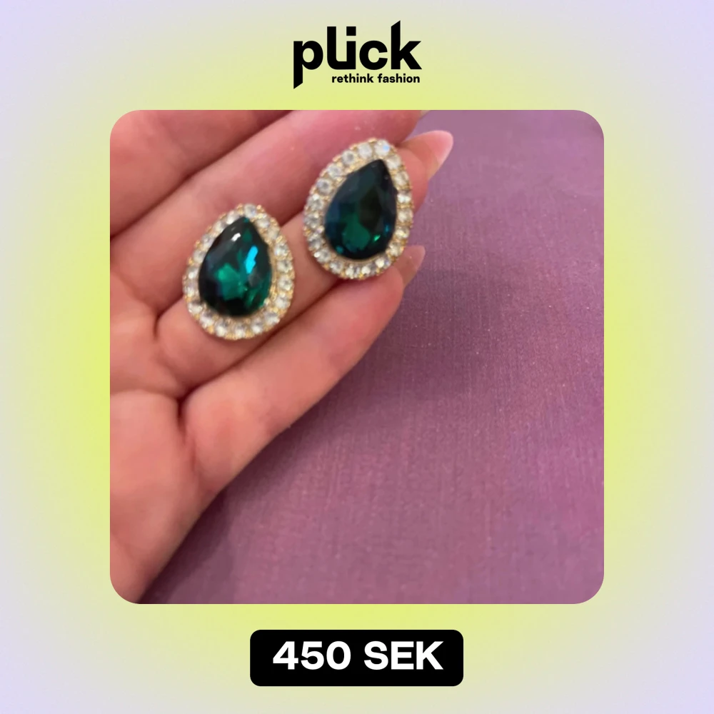 Säljer ett par eleganta örhängen med en stor grön droppformad sten omgiven av glittrande strass. Perfekta för att ge en touch av glamour till din outfit. De är i mycket bra skick och har en bekväm baksida för enkel användning.