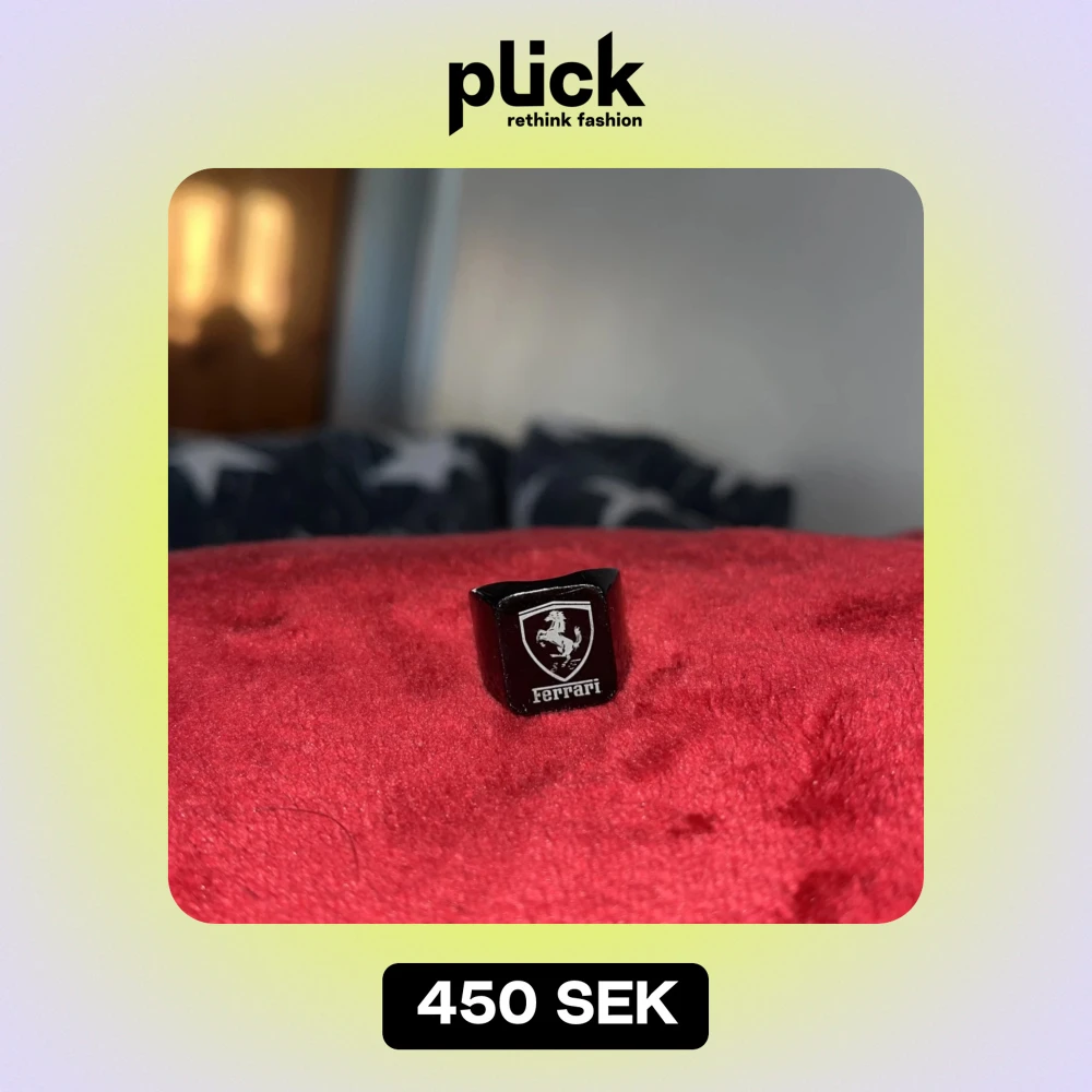 En Cool svart ring med den ikoniska Ferrari-loggan i silver. Perfekt för bilentusiaster eller som en statement-accessoar. Ringen har en blank yta och känns både modern och stilren. Passar till både vardag och fest!