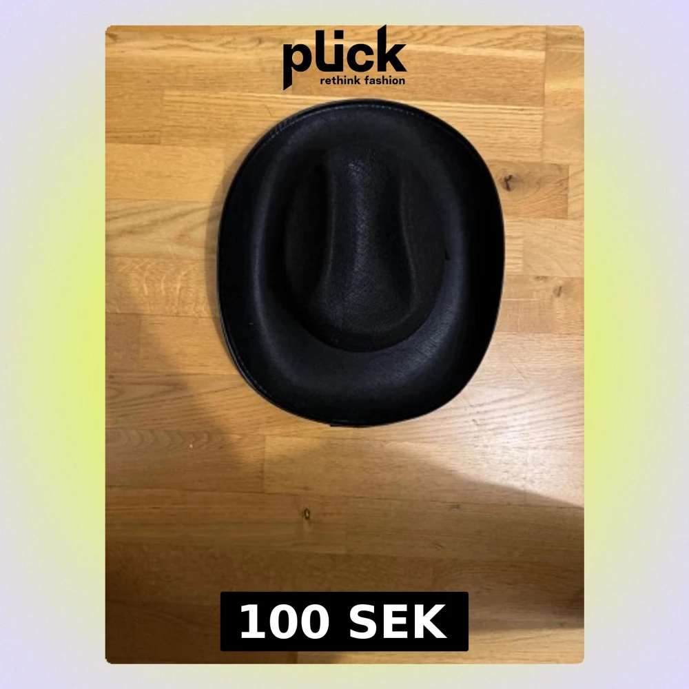 Säljer en svart cowboyhatt med klassisk form och böjd brätte. Hatten har ett tunt snöre som kan knytas under hakan. Materialet är filtliknande och ger en cool westernkänsla. Perfekt för dig som vill sticka ut med en ikonisk accessoar.