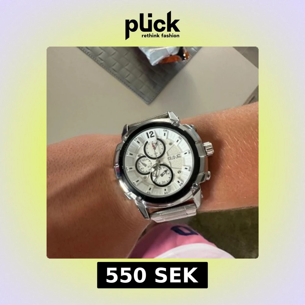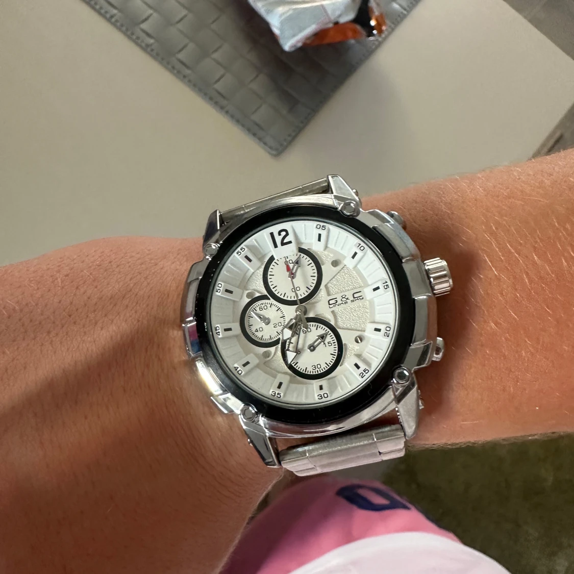 Stilren klocka från C&C med silverfärgat länkarmband och stor rund urtavla i vitt och silver. Klockan har tre mindre urtavlor, tydliga siffror och detaljer i svart. Perfekt accessoar för dig som gillar en sportig och modern look.