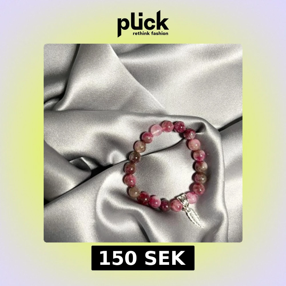 Säljer ett armband med runda pärlor i olika nyanser av rosa, lila och vitt. Armbandet har en silverfärgad berlock i form av ett löv. Perfekt accessoar för att ge din outfit en färgklick.