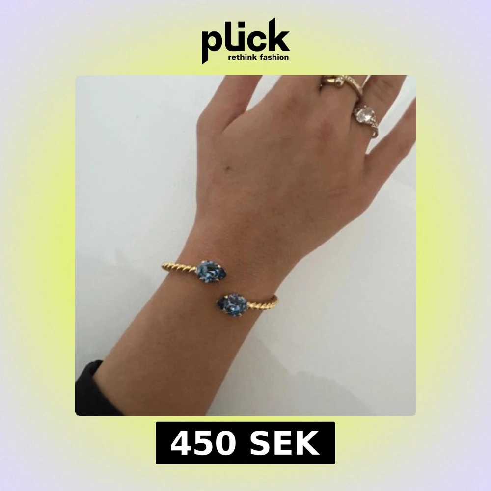 Säljer den för Halva priset!! Snyggt guldfärgat armband med tvinnad design och två stora droppformade blå stenar i varje ände. Armbandet är öppet och ger en lyxig känsla med sina glittrande detaljer. Perfekt accessoar för att lyfta din outfit.