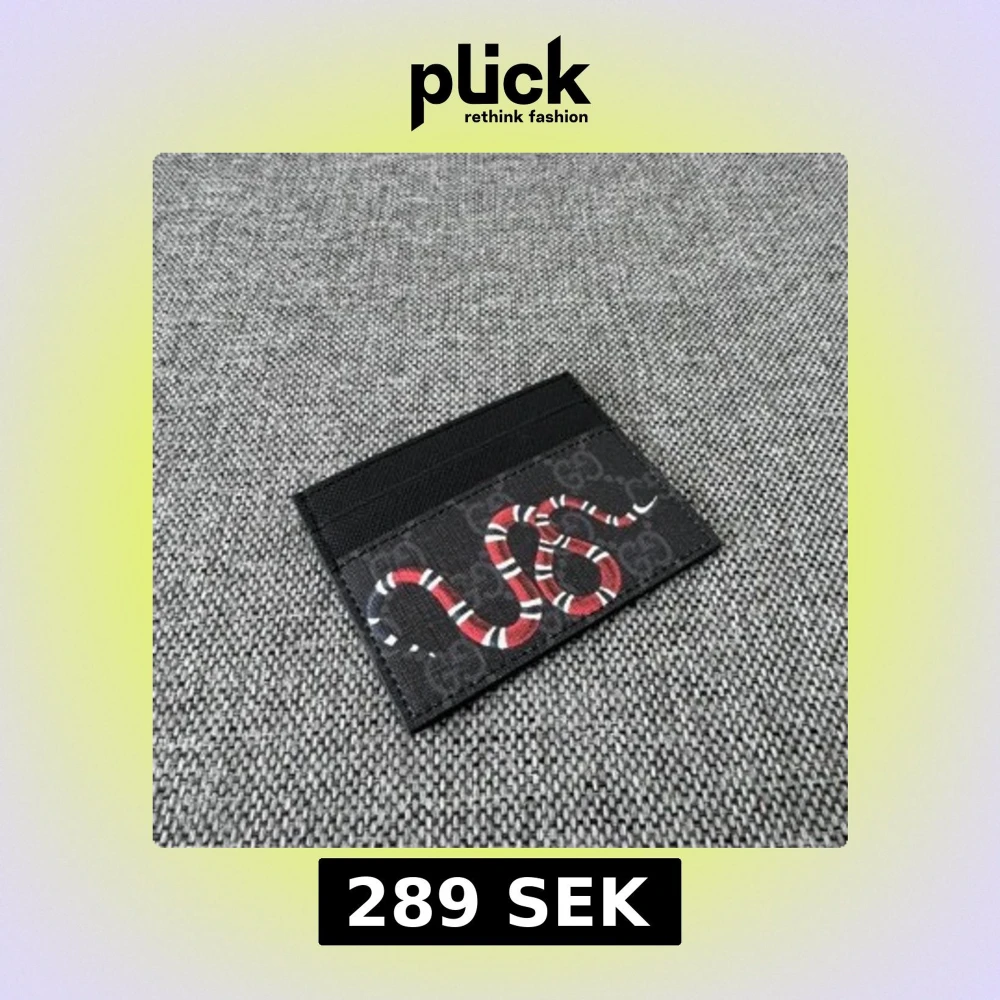 Slimmad svart plånbok från GG med ikoniskt GG-mönster och en fet röd, vit och svart ormprint på framsidan. Plånboken är tillverkad i skinn och har flera fack för kort. Perfekt för dig som vill ha något stilrent men ändå sticker ut.