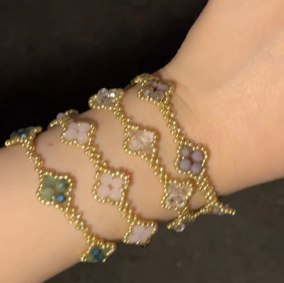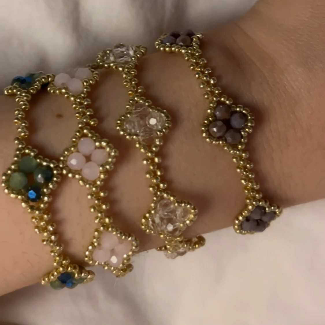 Fyra handgjorda armband med små guldfärgade pärlor och blommor i olika färger: grönt, rosa, lila och transparent. Varje armband har ett unikt blommönster av glaspärlor som ger en söt och trendig look. Perfekt för att addera färg och stil till din outfit. 30 kr/st