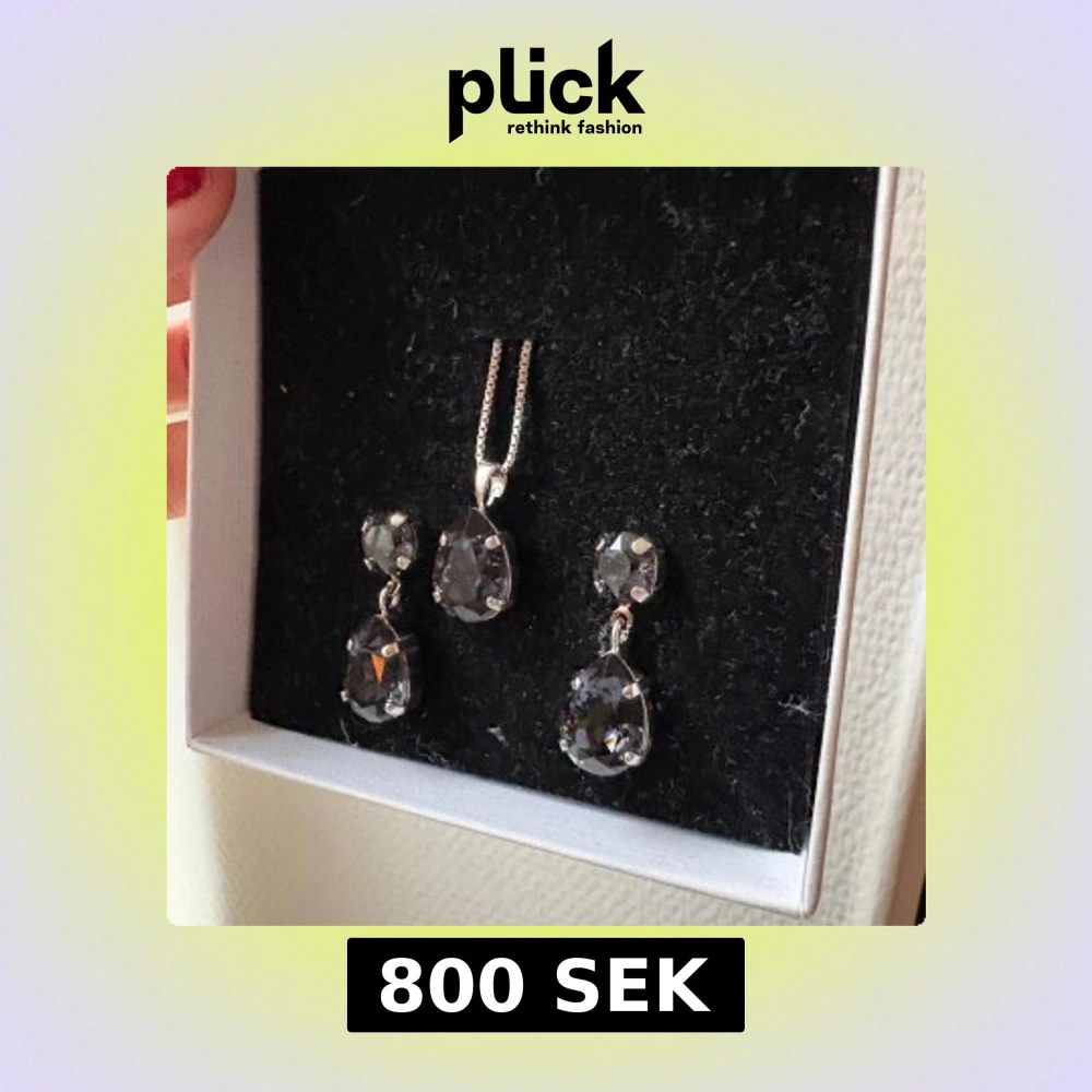 Snyggt smyckeset från Caroline Svedbom med ett halsband och ett par örhängen i silverfärgad metall. Både halsbandet och örhängena har droppformade, mörkgrå kristaller som glittrar och ger en lyxig vibe. Perfekt för dig som gillar statement-smycken med eleganta detaljer. Nypris 1795kr