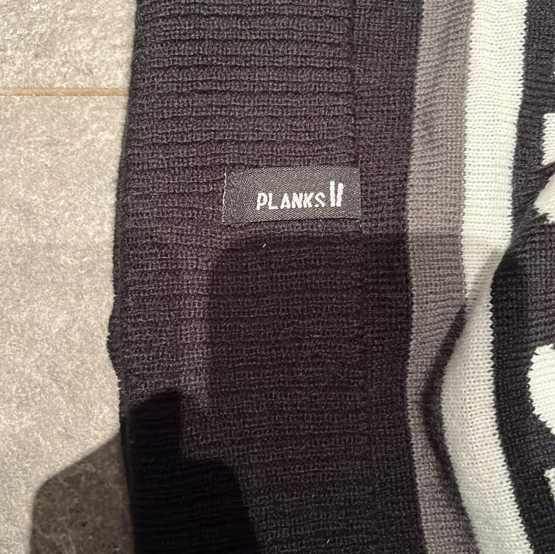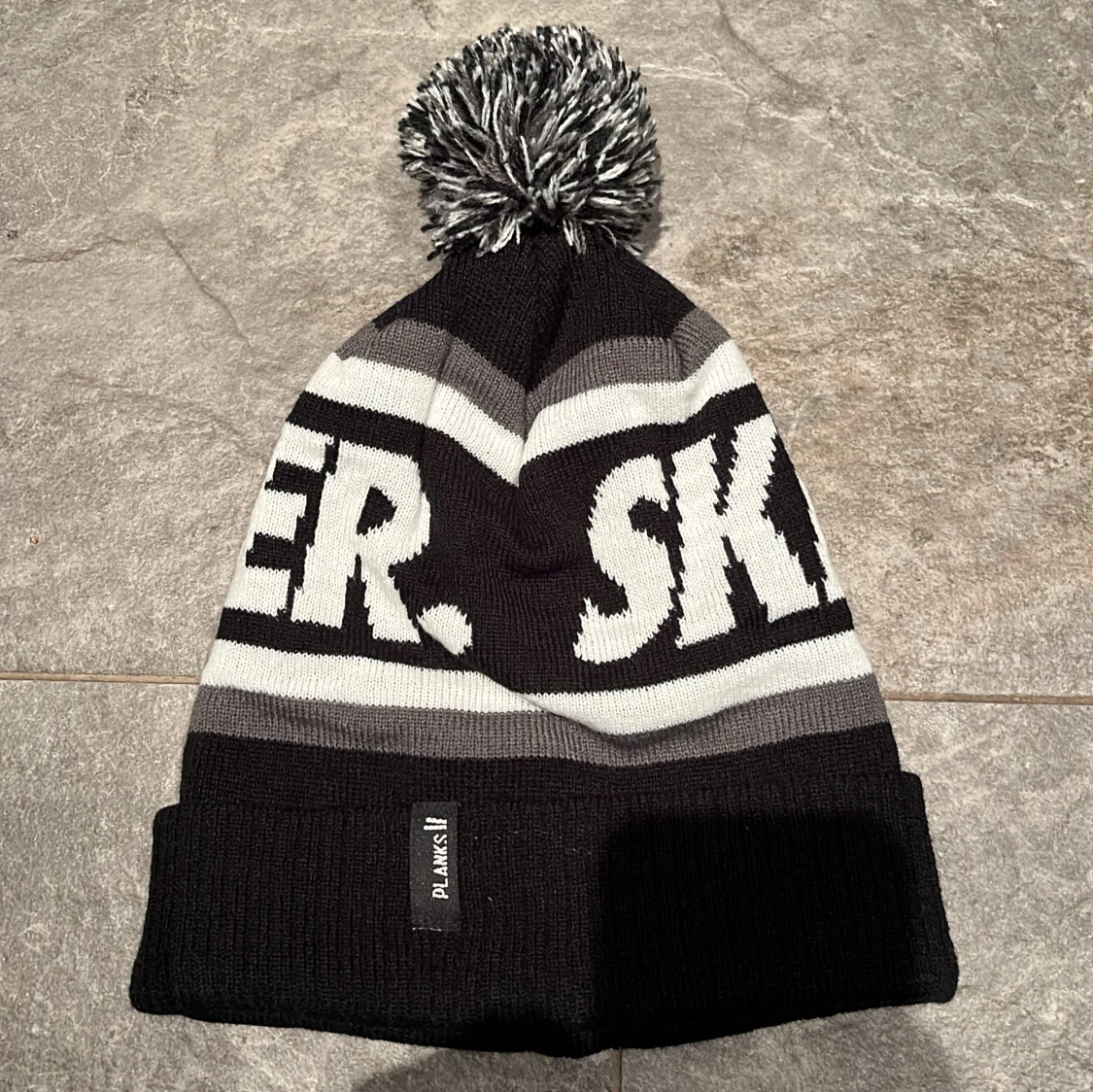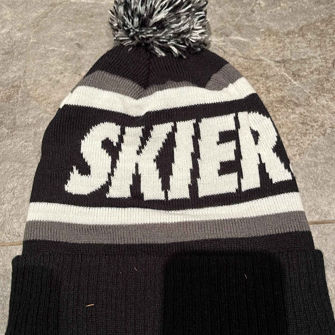 Snygg svart och grå mössa från Planks med texten 'SKIER' i vitt. Mössan har en stor tofs på toppen och är perfekt för kalla dagar. Den är ribbad och har en uppvikt kant för extra stil och värme.