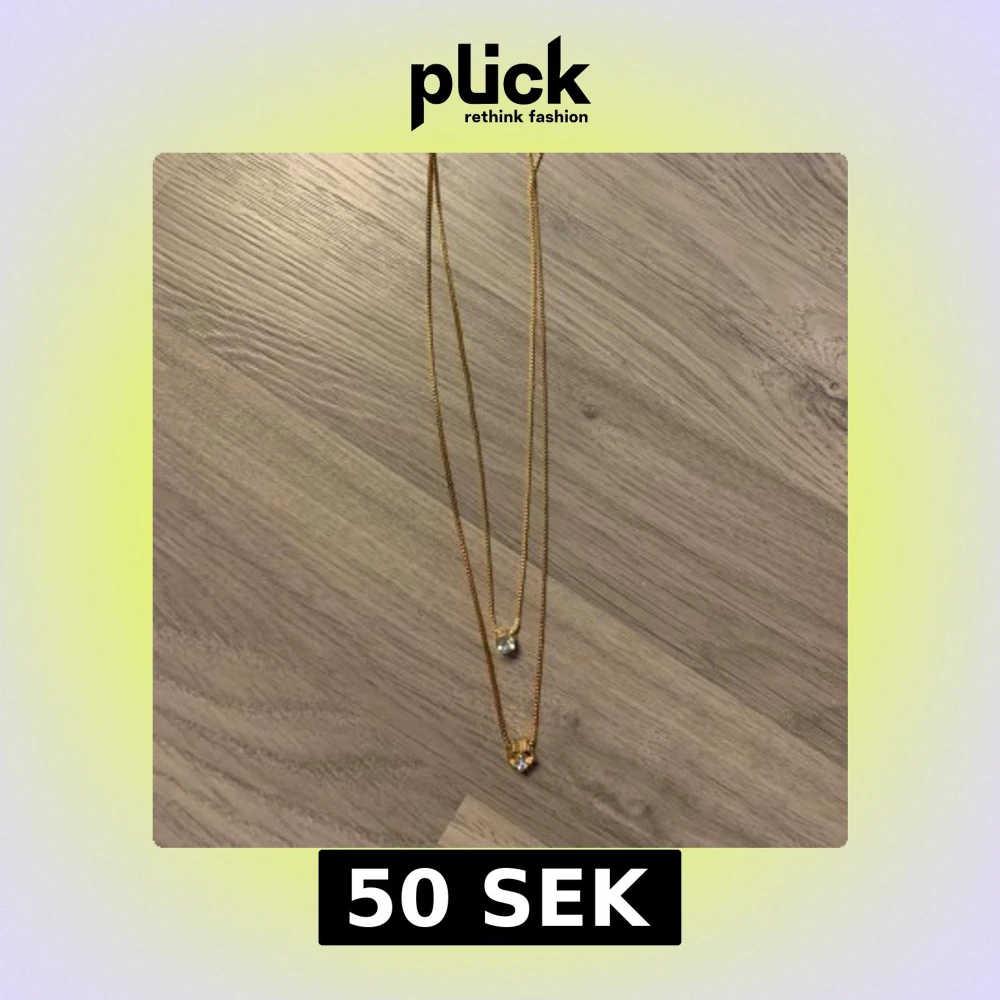 Elegant dubbelt halsband i guld med två kedjor. Det ena hänget är en klar sten och det andra är ett hjärta med en sten i mitten😁