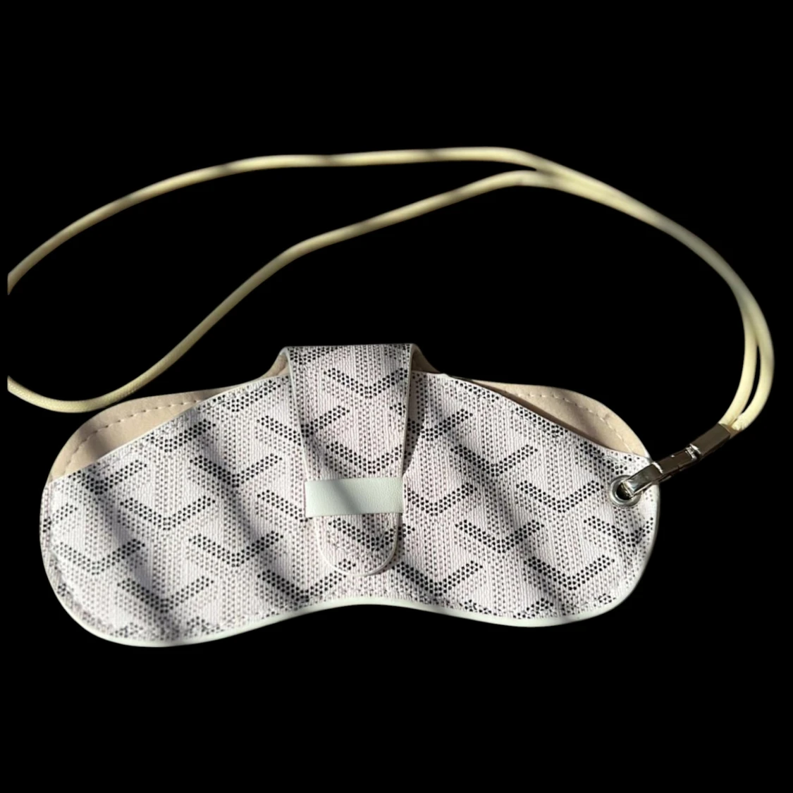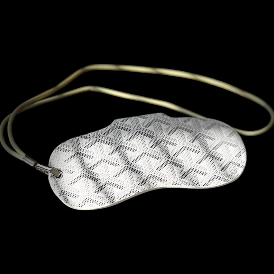 Snygg vit sovmask med geometriskt mönster i grått och svart. Masken har en mjuk form som följer ansiktet och ett elastiskt band med snörning för att sitta bekvämt. Perfekt för att blockera ljus när du vill vila eller resa.