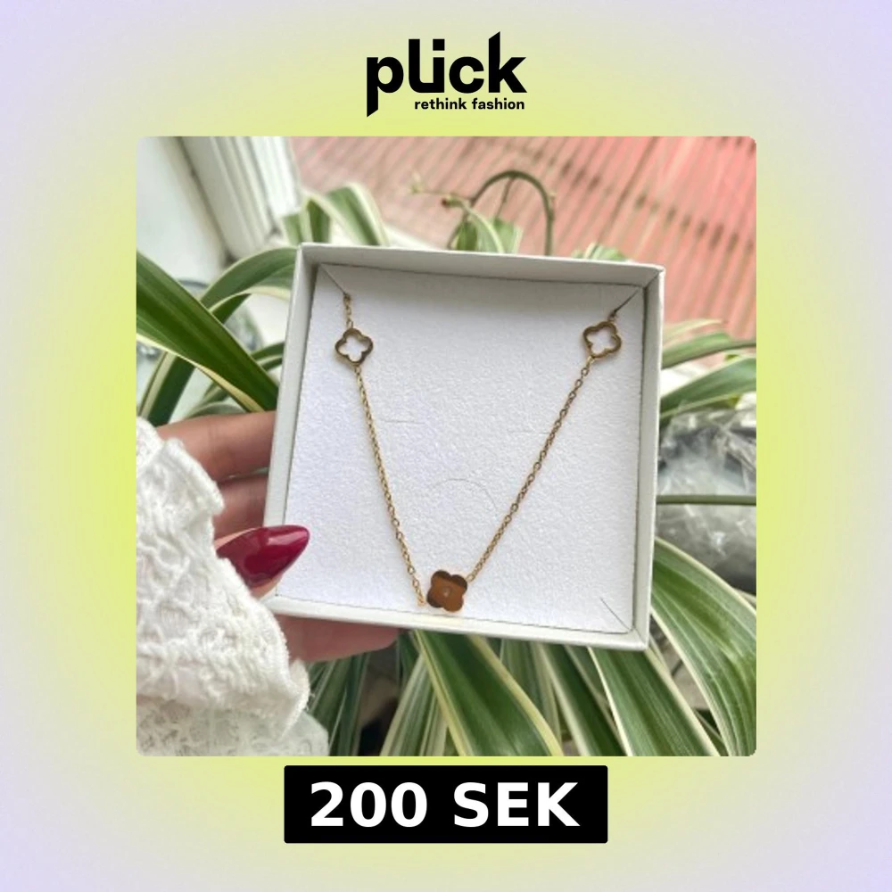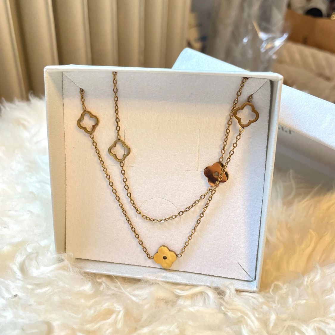Snyggt halsband i guldton med flera små fyrklöverformade blommor längs kedjan. Några av blommorna är fyllda, medan andra är öppna i metall. Perfekt för dig som gillar unika detaljer och stilren design. I rostfritt stål!