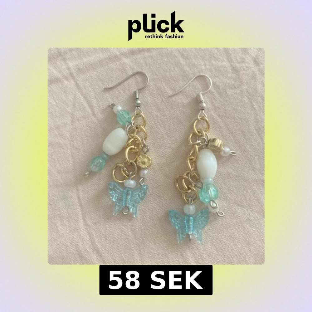 Unika örhängen med blå fjärilshängen i plast, guldfärgade kedjor och detaljer, vita pärlor och turkosa glaspärlor. Mixen av material och färger ger en lekfull och trendig vibe. Perfekta för dig som gillar statement-accessoarer och vill sticka ut.