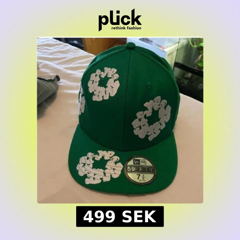 Snygg grön keps från Denim tears med broderade vita kransar. Modellen är 59/50 och har en klassisk passform. Perfekt för att ge din stil en unik touch.