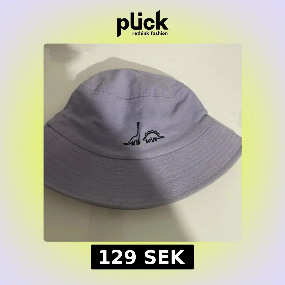 Säljer en ljuslila bucket hat med broderade dinosaurier framtill. Hatten har klassisk form med bred brätte och är tillverkad i bomull. Perfekt accessoar för att sticka ut med en lekfull touch.