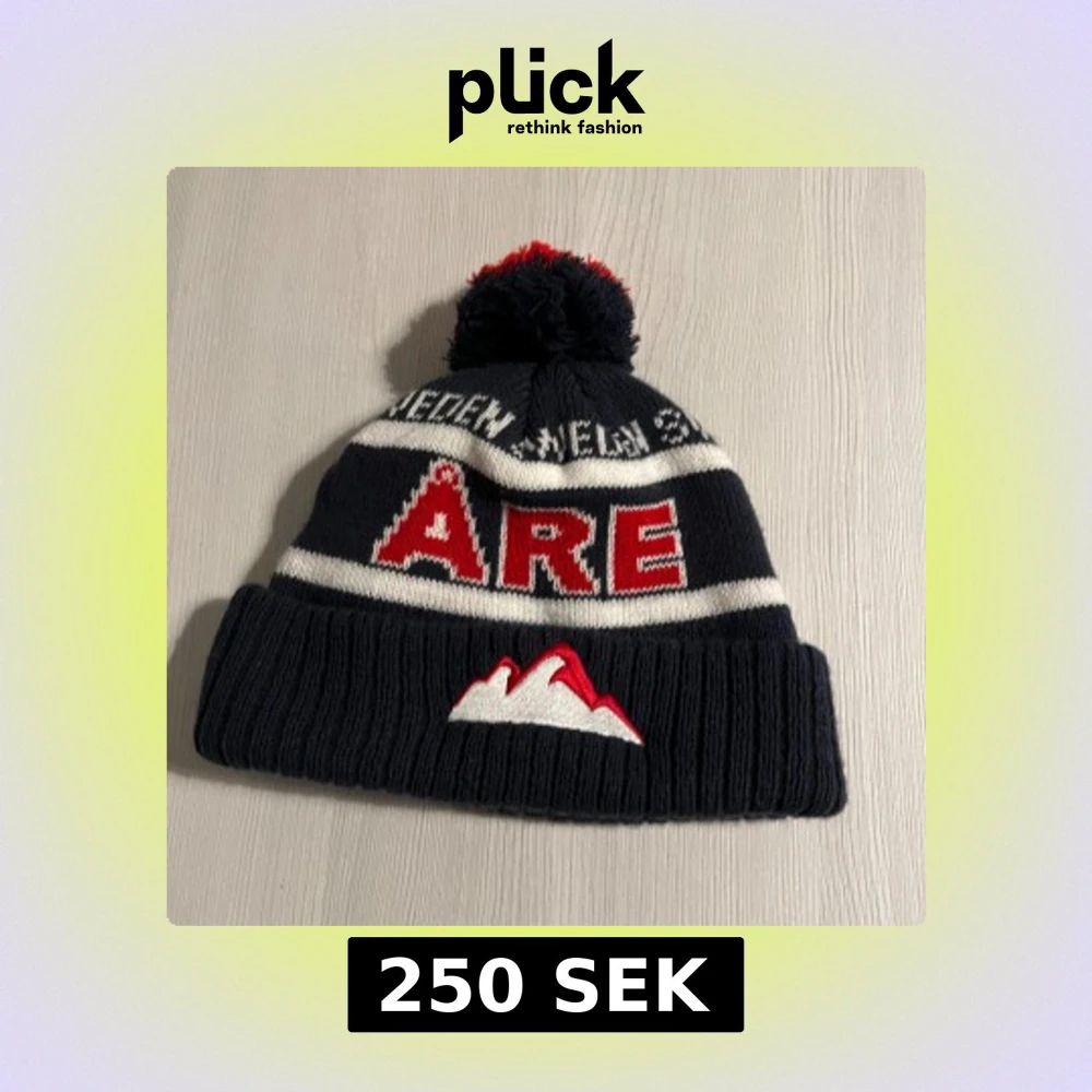 Säljer en mörkblå stickad mössa med vit-röda detaljer och tofs i rött och mörkblått. Mössan har bred uppvikt kant, broderat bergmotiv och texten 'ÅRE' framtill.
