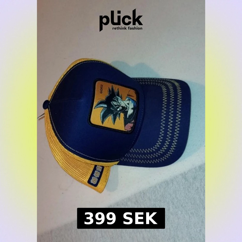 Snygg blå och gul truckerkeps från Capslab med Goku-motiv från Dragon Ball Z framtill. Kepsen har mesh-bakstycke i gult, böjd skärm med dekorativa sömmar och justerbar snapback. Materialet är polyester och bomull, perfekt för animefans. Köpt från Tyskland för 120 Euro. Och säljs för att jag inte har använding av den.
